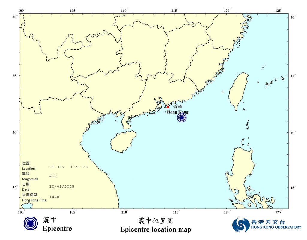 據香港天文台的初步分析,2025年1月10日下午2時40分廣東汕尾以南海域發生一次4.2級地震,震中位於北緯21.30度,東經115.72度附近,即香港天文台之東南約200公里(即距離香港之東南約200公里),震源深度約10公里。