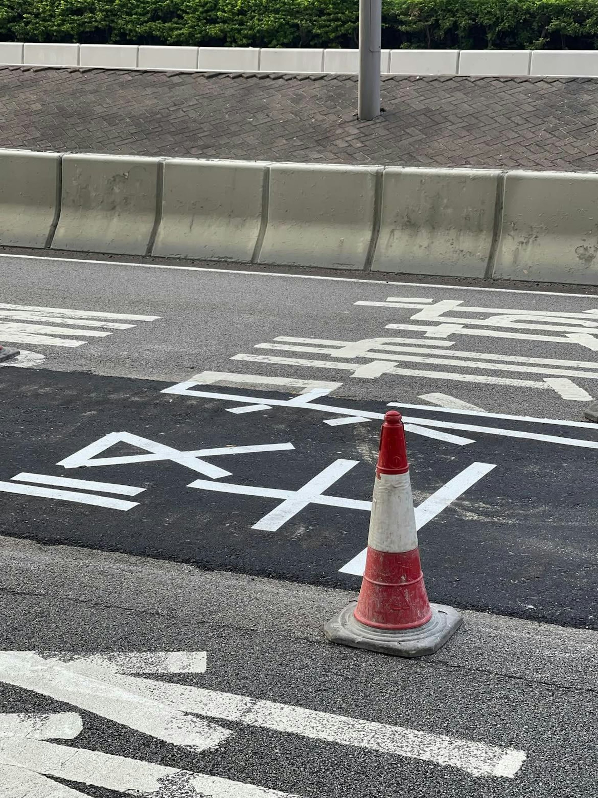 有網民昨日(9日)放工時間特地到現場看有關情況。該名網民發現有關路面正在進行重鋪工程,相信有關的路面標示是在重鋪時臨時加上,而英文部分使用的串法正確,但中文的錯誤仍未清去。