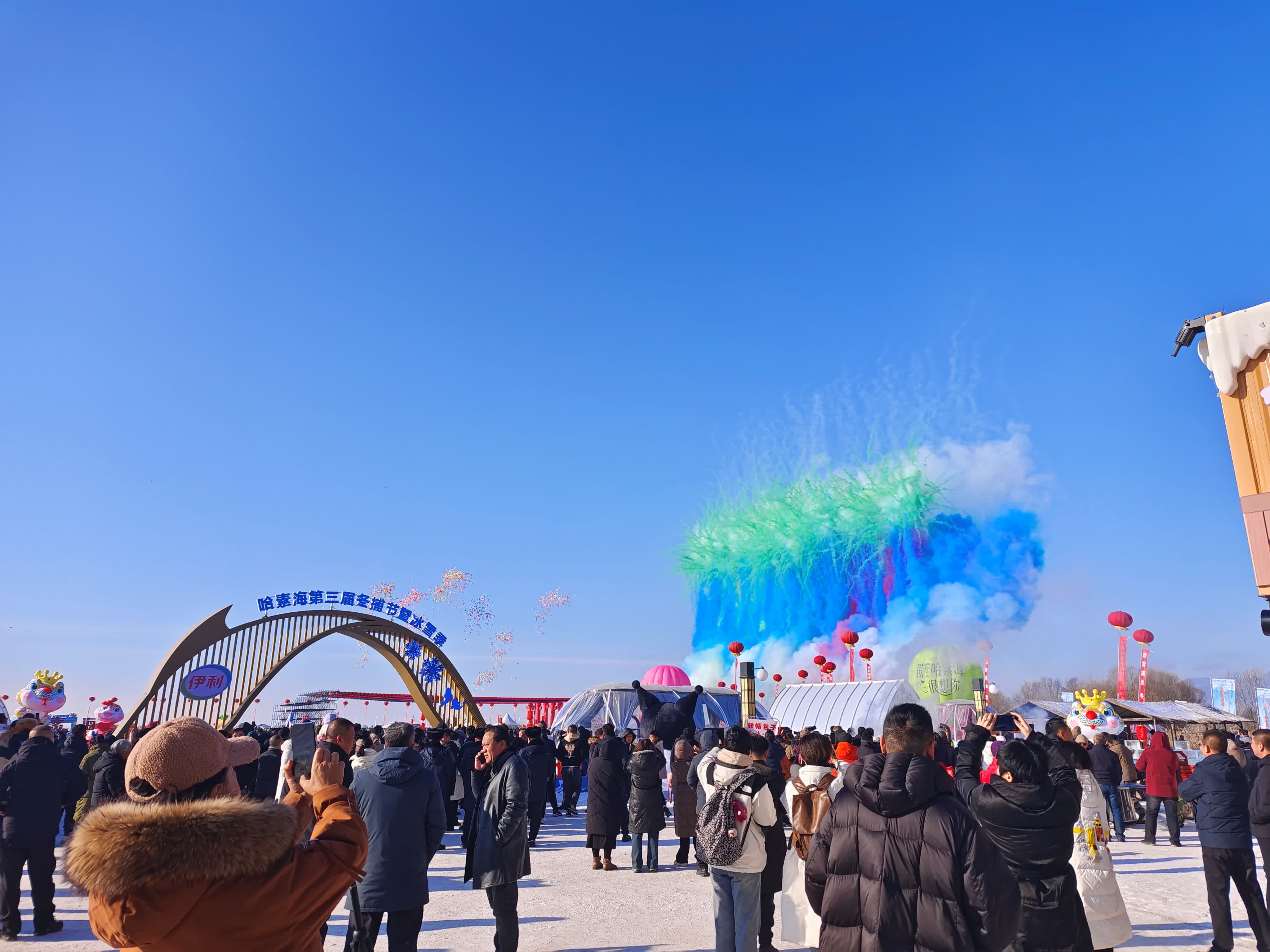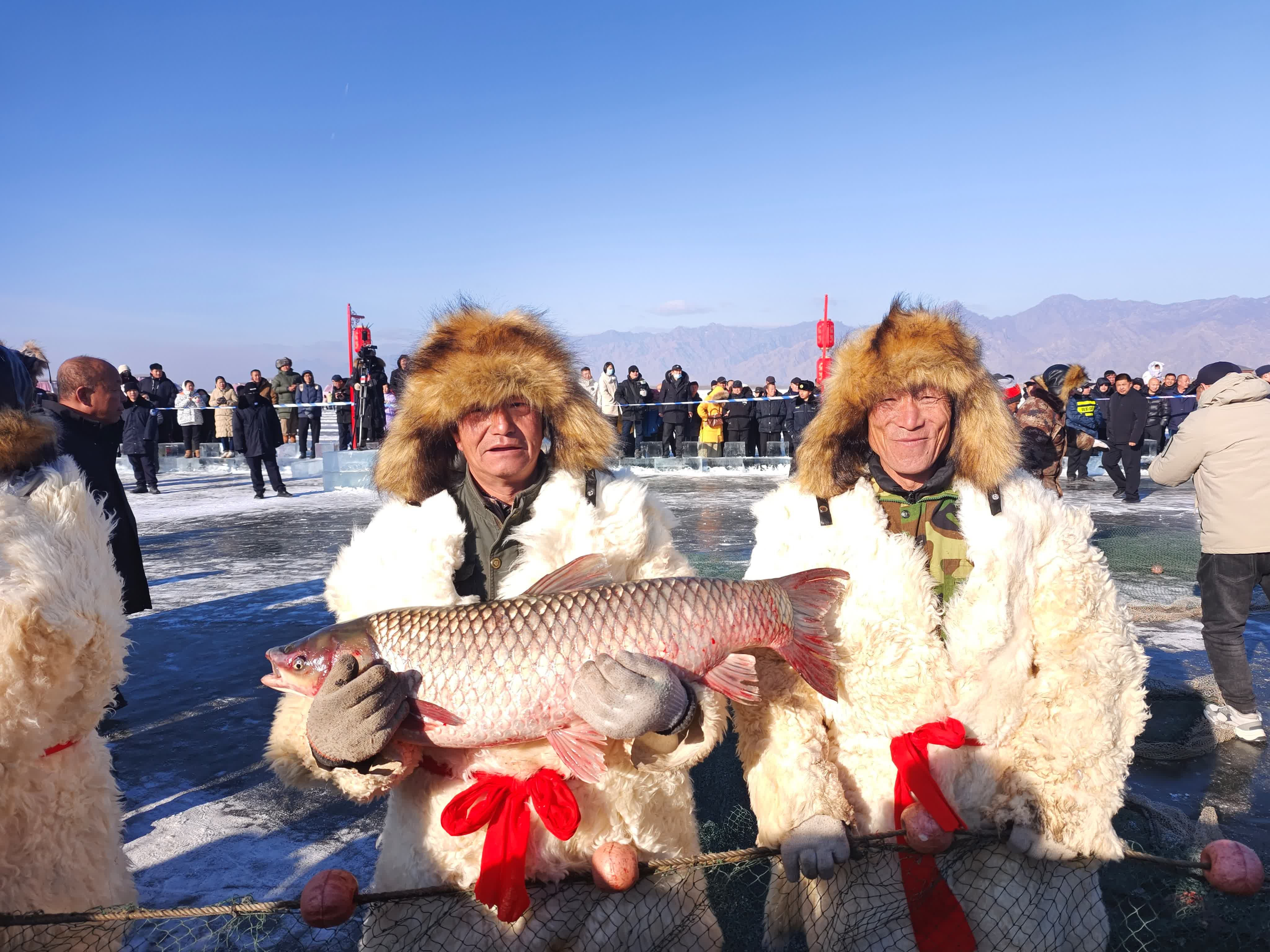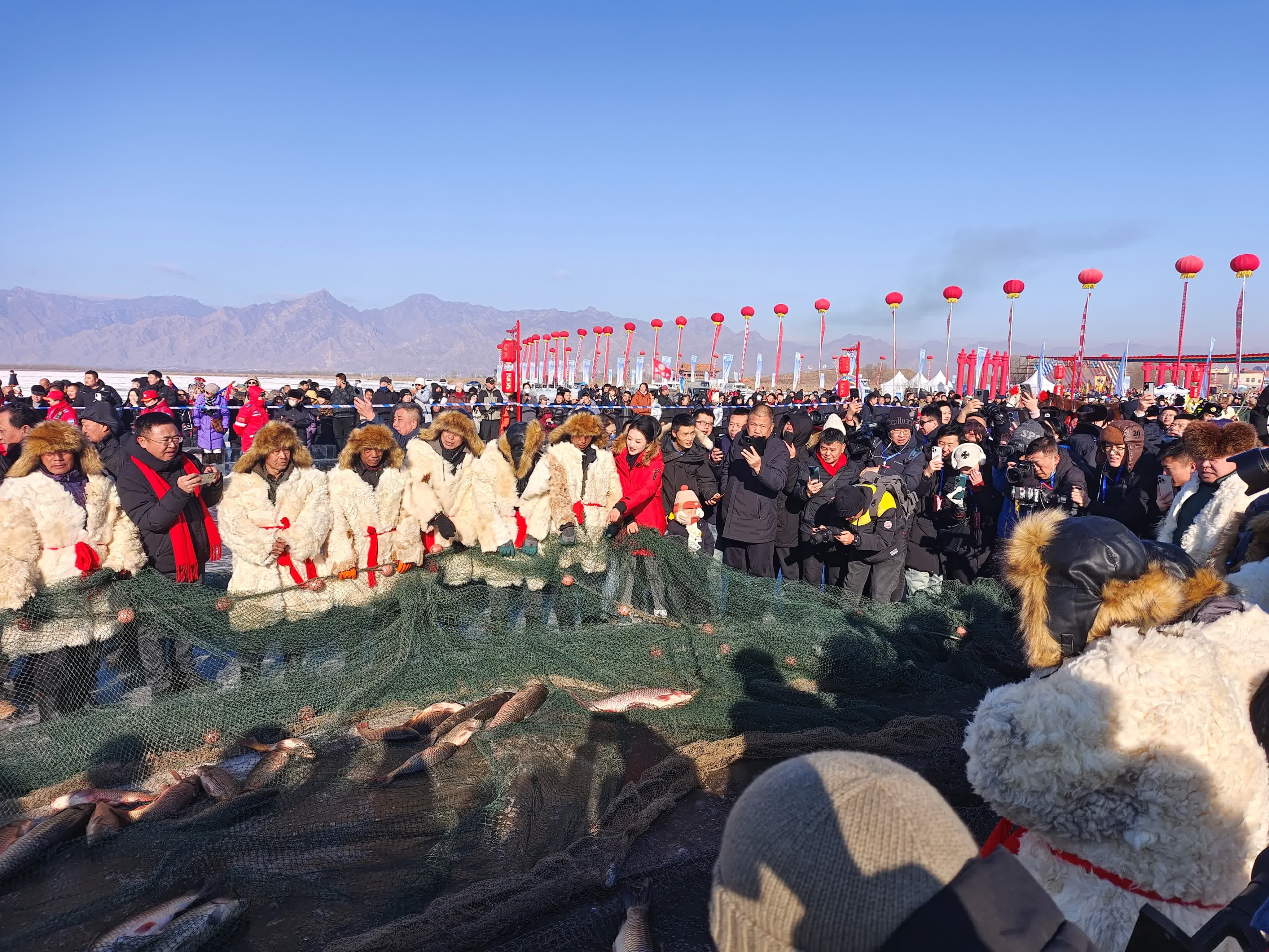 開幕式現場精彩紛呈,高潮迭起。開場節目瞬間點燃了現場觀眾的熱情。緊接着,《五彩漁夢哈素海》情景劇以其獨特的藝術魅力,生動展現了哈素海冬捕的悠久歷史和漁獵文化。隨後,冬捕起網環節更是將活動推向了高潮,頭魚拍賣環節吸引了眾多遊客和商家的積極參與,最終頭魚以高價成交,寓意着豐收與吉祥。與此同時,冰上娛樂、集裝箱市集、星空露營、主題生活館等項目也同步開放,為遊客們提供了豐富多彩的體驗選擇。