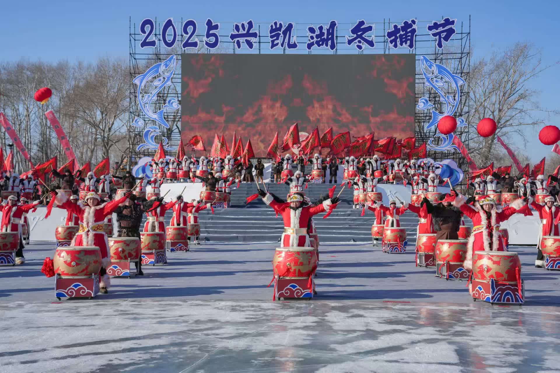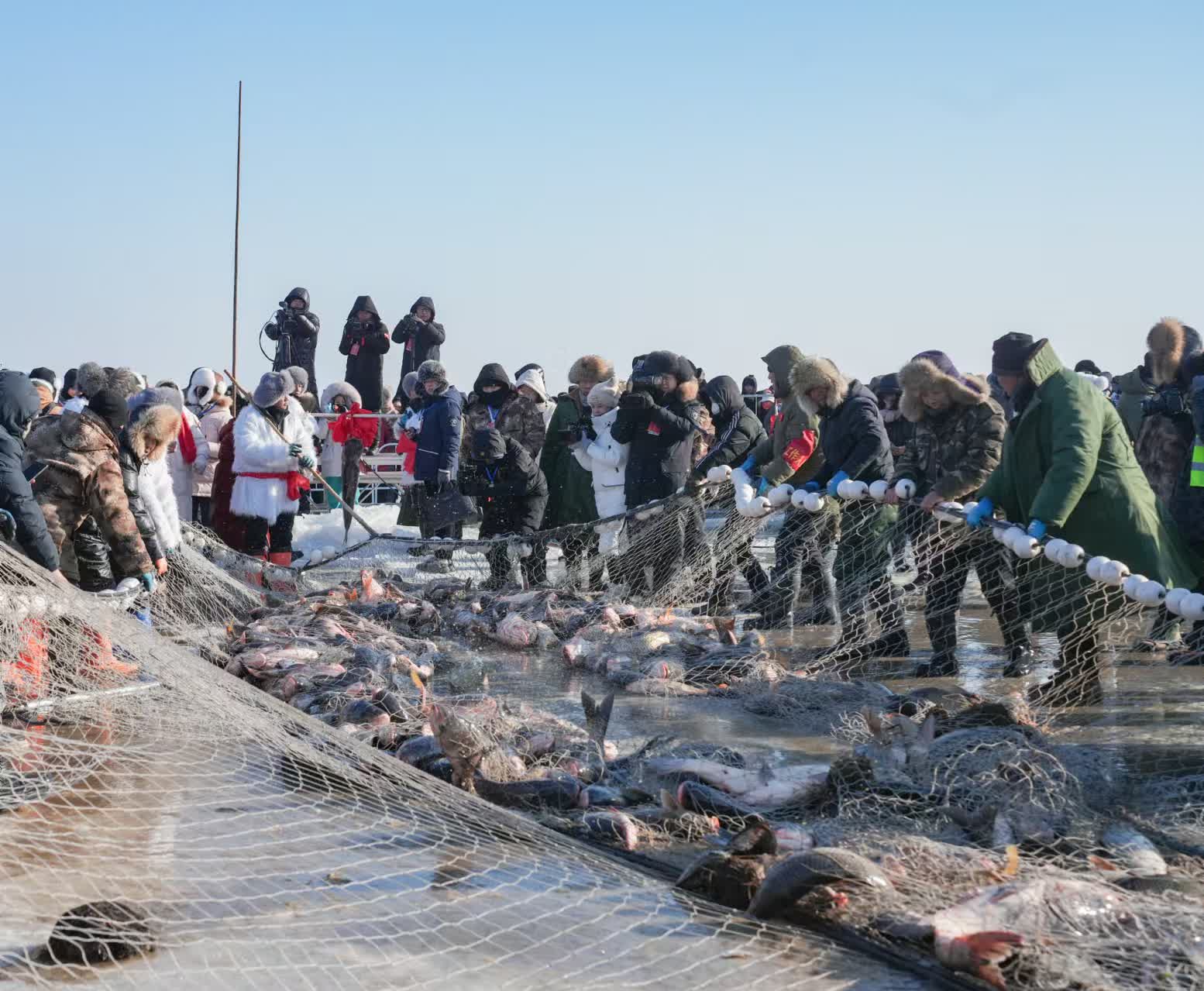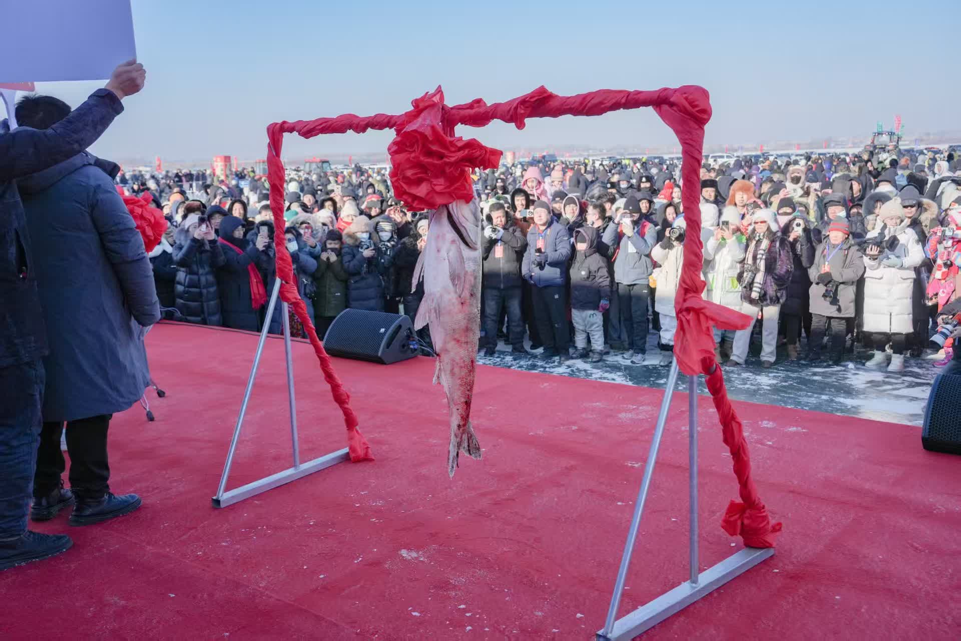 開幕式上,通過「迎風旗」「震天鼓」「祈福詞」「出征酒」等篇章,近百名表演者生動再現了傳統古老的肅慎漁獵文明,為現場觀眾帶來了一場視覺與文化的雙重盛宴。隨着雄渾的「拉網號子」響起,冬捕節正式拉開帷幕。漁民們在冰面上熟練地拉網,大白魚、花鰱、鯉魚各種肥美的魚類隨網而出,展現了「冰湖騰魚」的壯觀景象。