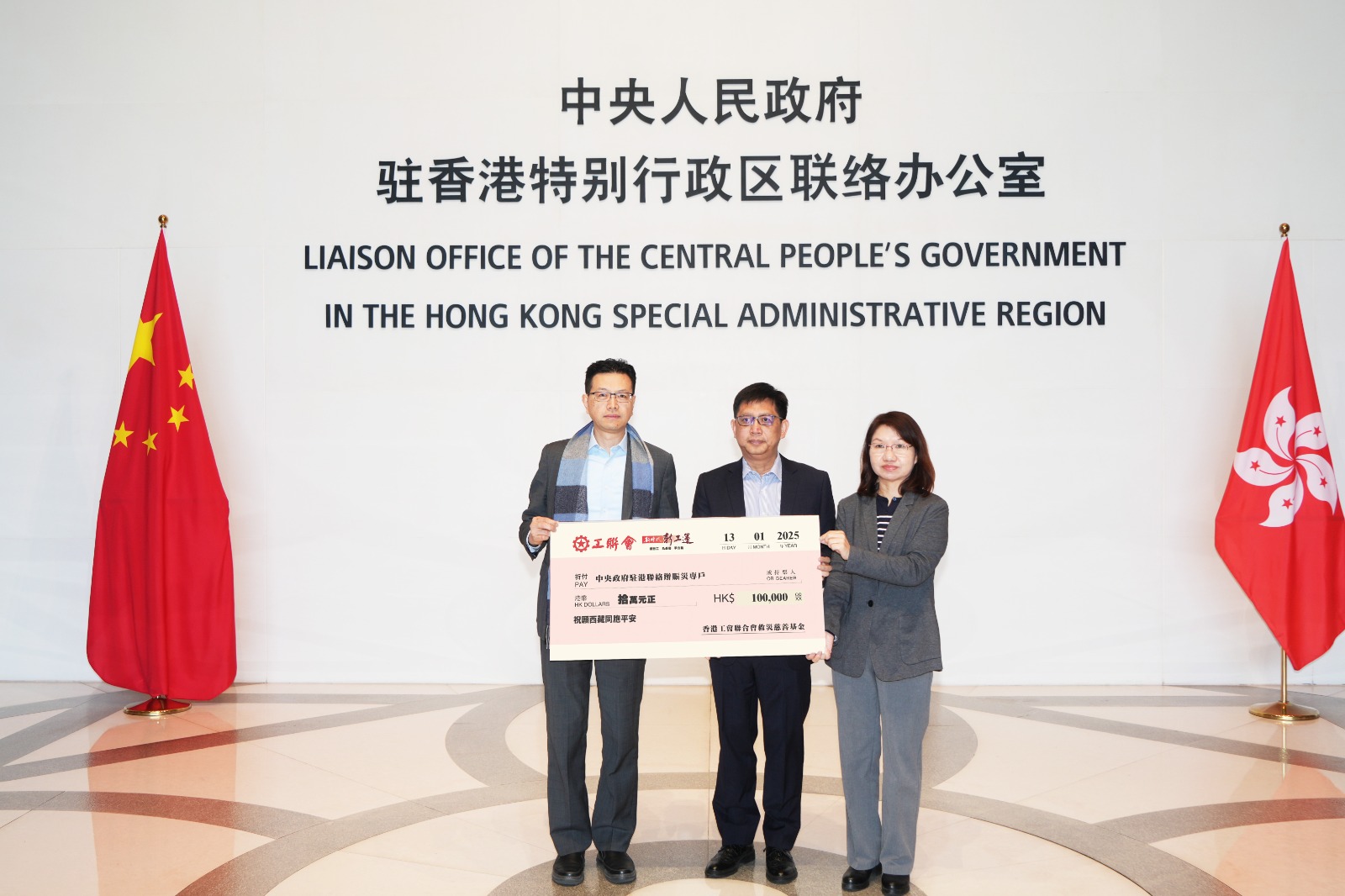 大公文匯全媒體報道,西藏自治區定日縣早前發生6.8級地震,最少造成百多人遇難,超過3600戶房屋倒塌,約6.15萬人有不同程度受災。工聯會心繫受災同胞,本着「一方有難 八方支援」的精神,從救災慈善基金撥出10萬元善款援助災區,並第一時間發起全港籌款行動。工聯會會長吳秋北,副會長曾志文今日(13日)將善款支票遞交給中央政府駐港聯絡辦轉交西藏政府部門作為賑災之用,由中央政府駐港聯絡辦社工部副部長吳小玔代表接收。