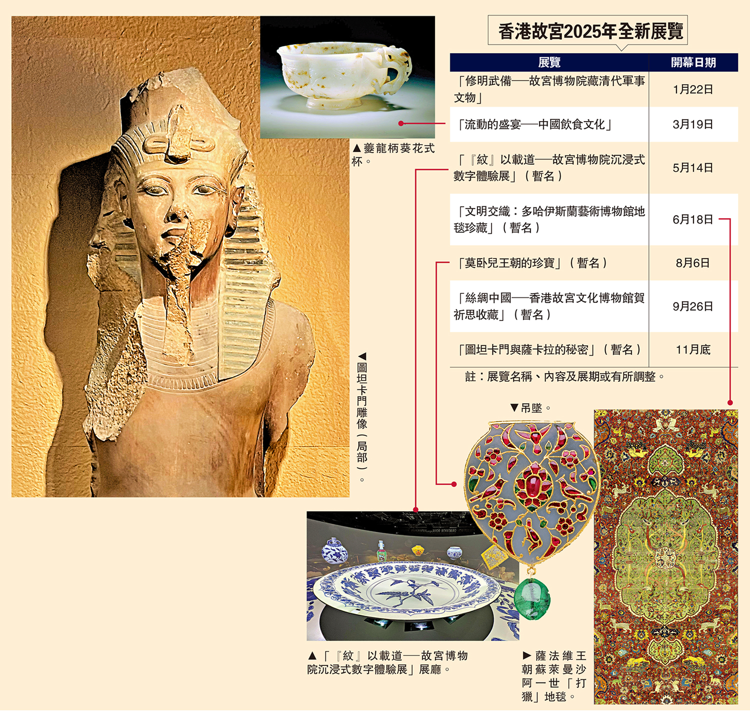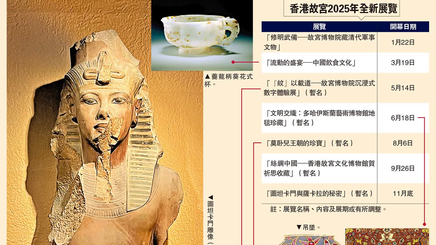 大公報報道,香港故宮文化博物館(香港故宮)自2022年7月開幕以來,已舉辦超過20場專題及特別展覽,展示故宮博物院、香港故宮以及世界各地其他重要文化機構的珍品,總參觀人數近300萬人次。香港故宮2025年將推出四個新的特別展覽和三個新專題展覽,主題涵蓋故宮博物院珍藏、世界古代文明和香港故宮最新館藏,其中包括11月開幕的「圖坦卡門與薩卡拉的秘密」古埃及珍寶展。