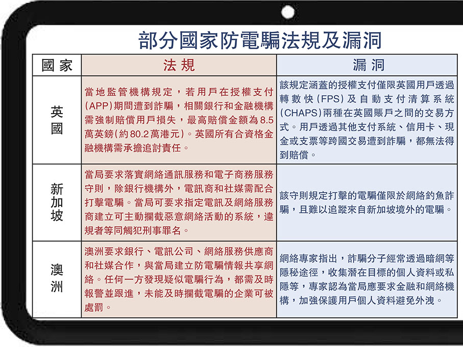 新加坡本月初通過新法案,擴大警方打擊電騙權力,如果有證據顯示有民眾疑似正被詐騙,警方有權無須事先通知,即凍結這些人士的銀行賬戶、暫停可疑交易。泰國計劃本月頒布行政命令,要求銀行和電訊運營商承擔預防電騙責任,如果使用其服務的用戶遭詐騙,相關企業需賠償損失。