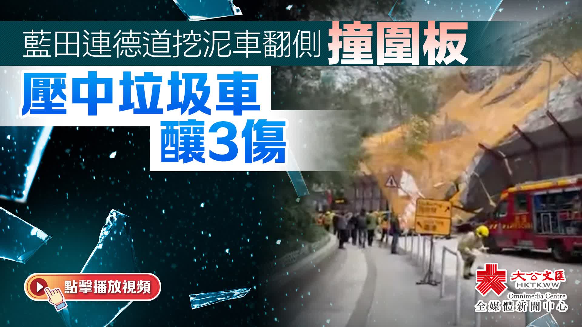 大公文匯全媒體報道,藍田連德道有棚架倒塌,3人受傷。今晨(14日)9時41分,藍田康華苑對開連德道一處擴闊工程的斜坡地盤發生意外,有棚架倒塌,壓中一輛途經的垃圾車,三人受傷。