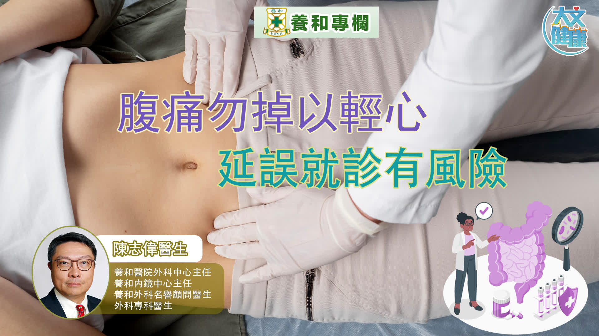 一般常說的盲腸炎,醫學上稱為「急性闌尾炎」,典型症狀是右下腹痛,稍為觸碰也會帶來劇痛,伴隨包括輕微發燒、⻝慾不振等病徵,主要治療方法是透過手術切除闌尾。然而,較少人認識的「大腸憩室炎」,病發症狀與闌尾炎極為相似,但診治方法卻大有不同。此文旨在為大家簡介這兩種引致下腹痛的炎症,提醒病人留意危險信號,切勿因延誤求診引致嚴重的併發症。