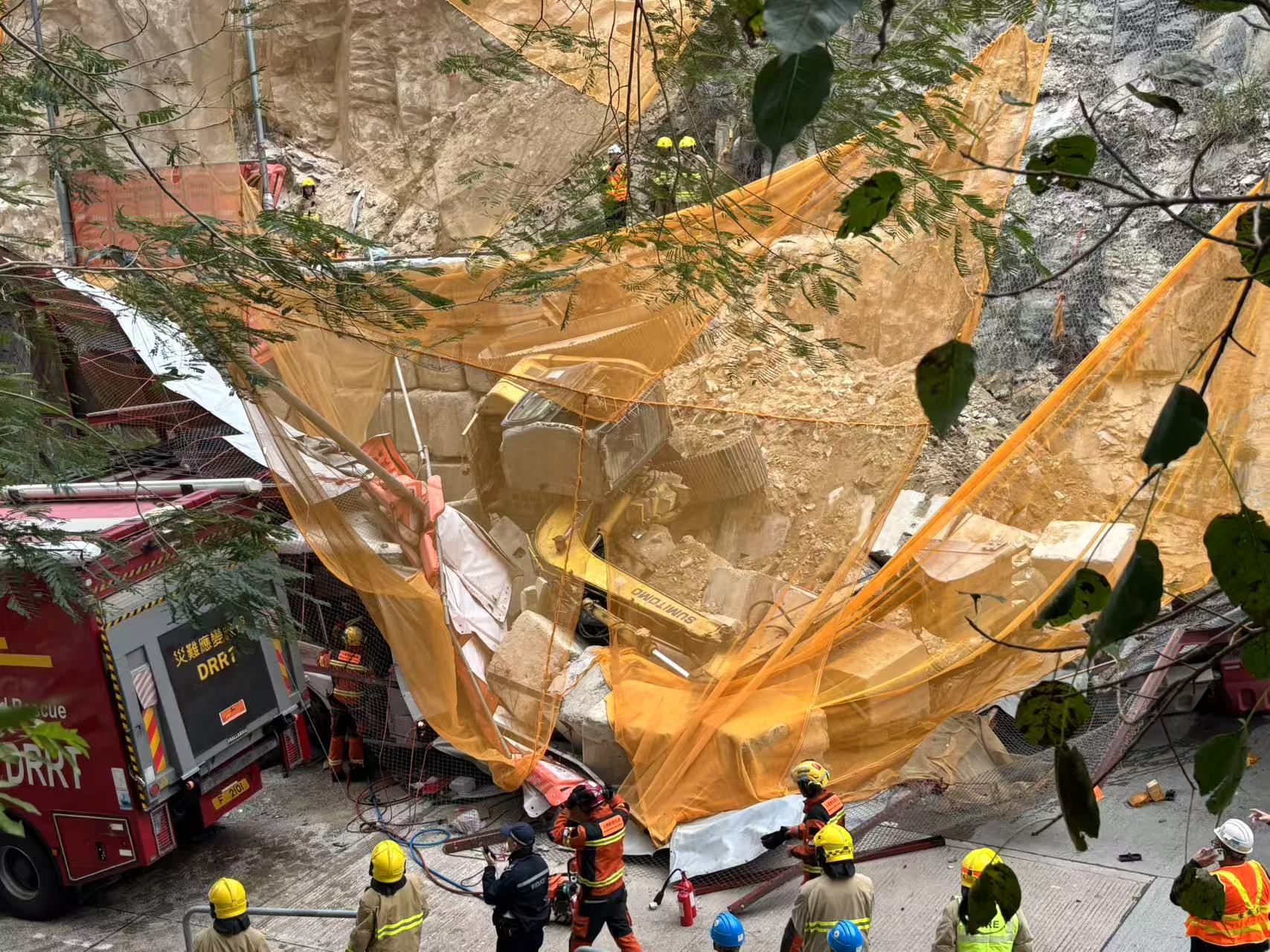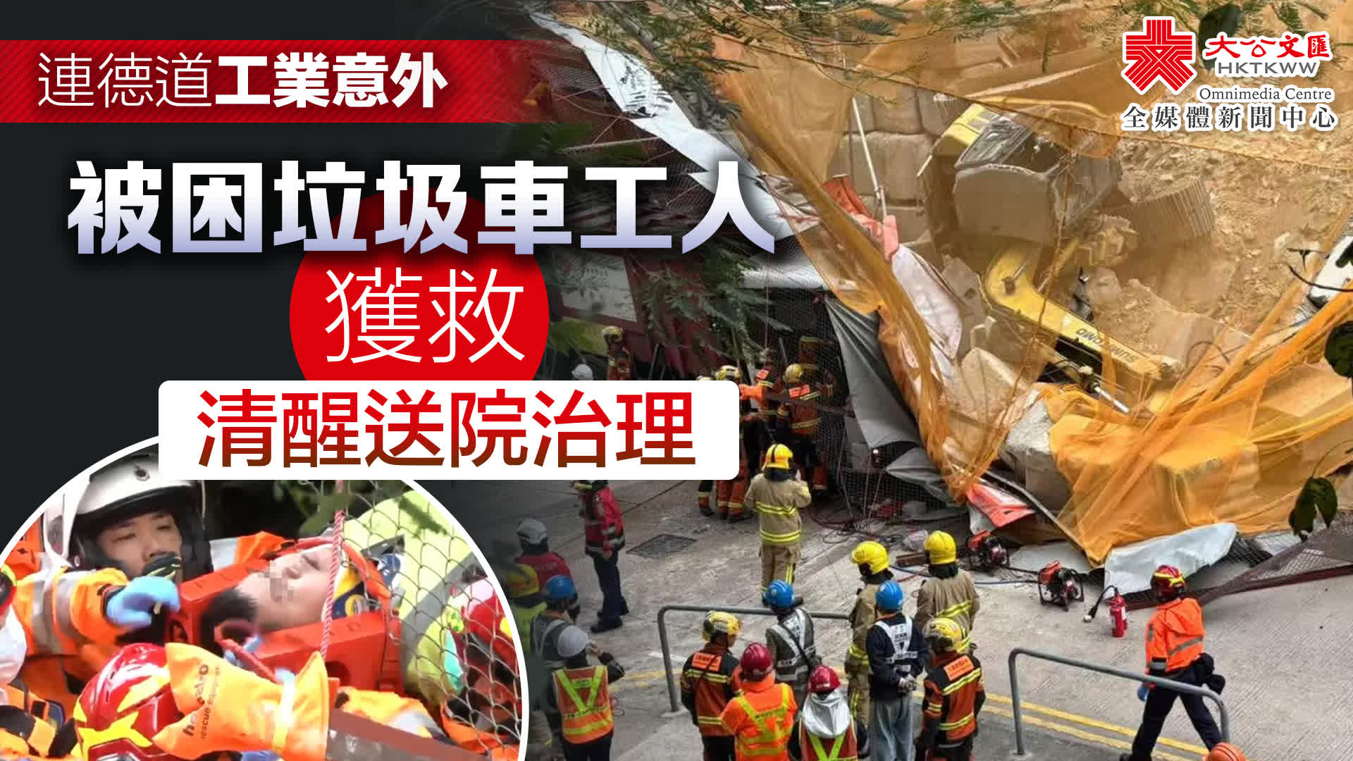 事故發生後,挖泥車及垃圾車司機分別爬出車外,垃圾車副駕位置一名男子被困,消防出動災難應變救援隊營救。經過逾3小時的救援,中午12時37分許,被困的工人獲救,清醒送院治理。