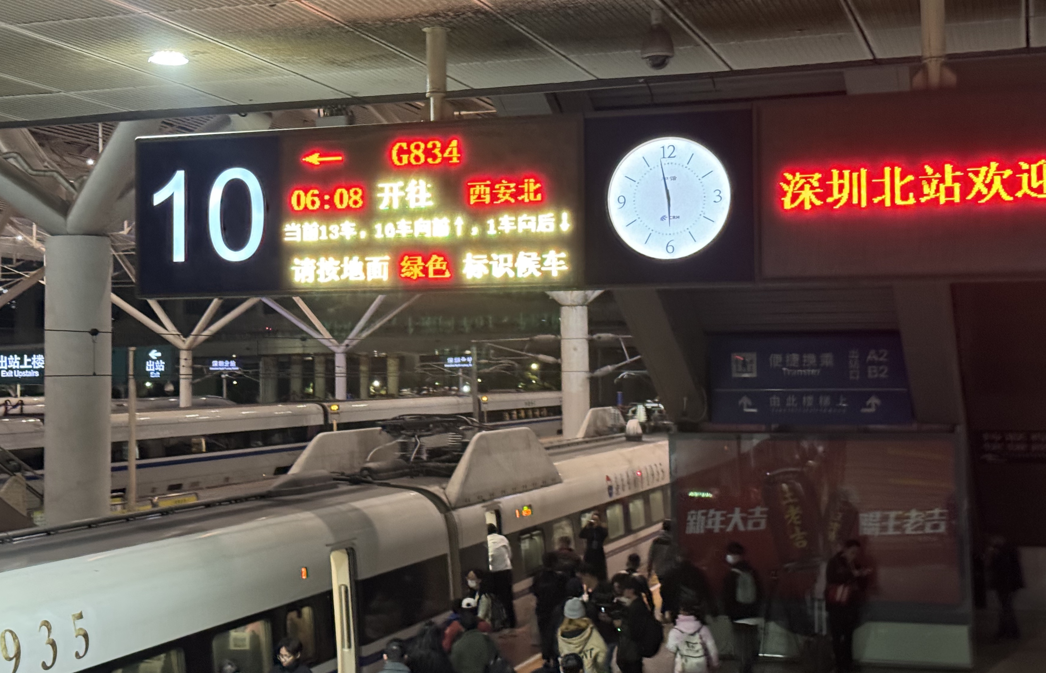 (大公文匯網 記者 郭若溪)1月14日,6時08分,G834次列車在深圳北站10站台緩緩啟動,為期40天的春運正式開始。這場年度最大規模的人口遷徙,將見證人們回家的旅程和家庭的團聚,更承載着無數旅客對家的深深思念。「今天,深圳鐵路預計共發送旅客超26萬人次。其中,深圳北站預計發送旅客17.5萬人次。」深圳車站客運科科長劉鎮文介紹到。「深圳北站客流主要發往雲貴、江西、湖南、湖北、福建等地區。」