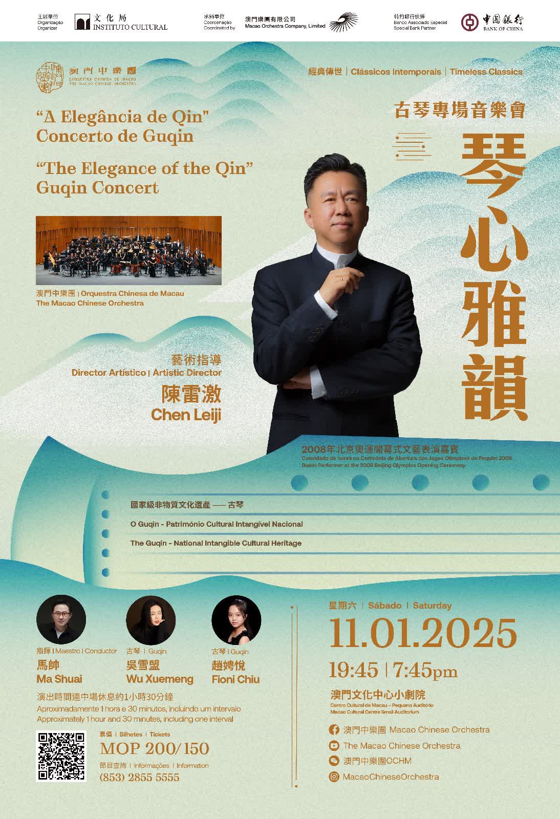 承載華夏民族三千年智慧文明的古琴,蘊含極為深厚的文化內涵,2003年獲聯合國教科文組織納入「人類非物質文化遺產代表作名錄」。由澳門文化局舉辦的澳門中樂團2024-2025樂季節目古琴專場音樂會《琴心雅韻》於1月11日晚上7時45分在澳門文化中心小劇院上演。當代古琴藝術領軍人物陳雷激擔任藝術指導及古琴演奏,親自獻演多首古琴名曲,更呈獻兩首世界首演的為本場音樂會全新創作的古琴獨奏及協奏曲。