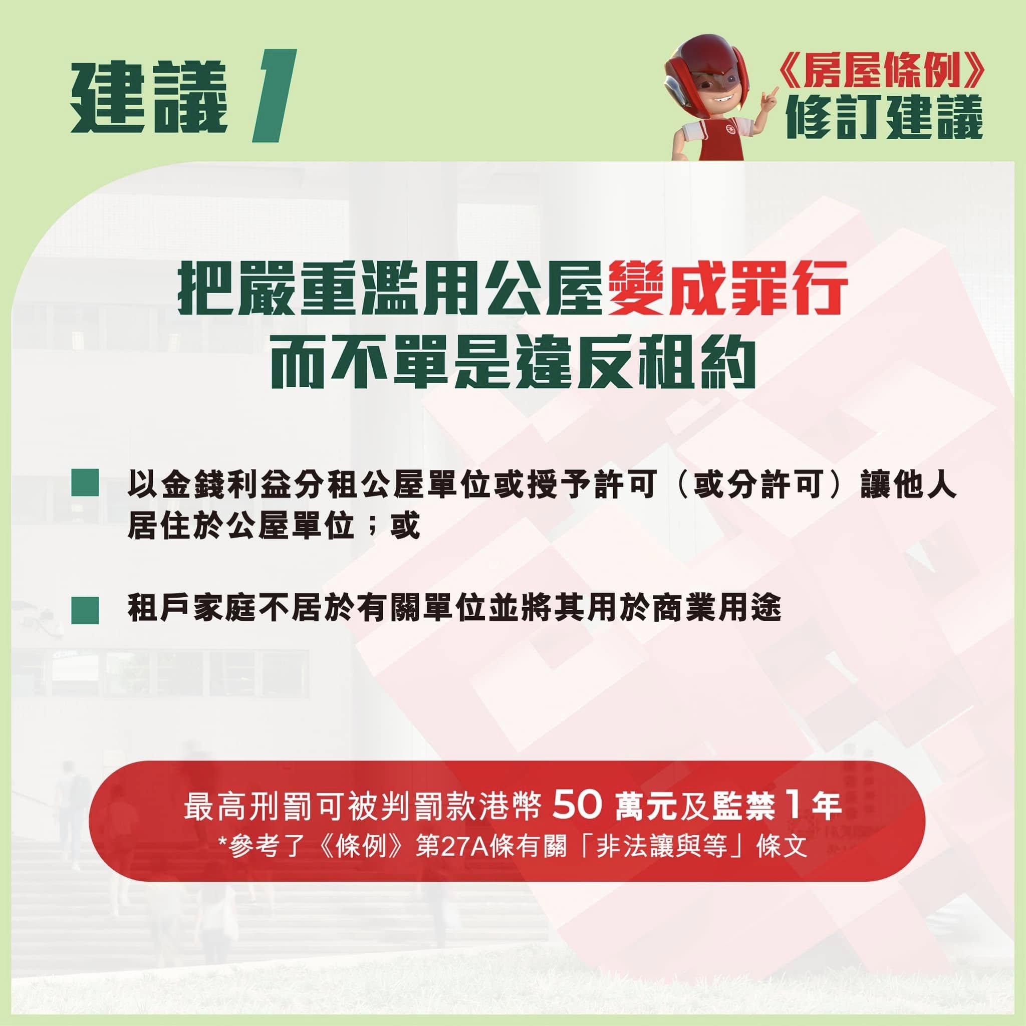 大公文匯全媒體報道,房署資助房屋小組委員會今日(14日)開會,就修訂《房屋條例》討論。房屋局局長何永賢今日(14日)在社交平台發文,附上四大修訂建議的圖片,強調濫用公屋須負刑責。