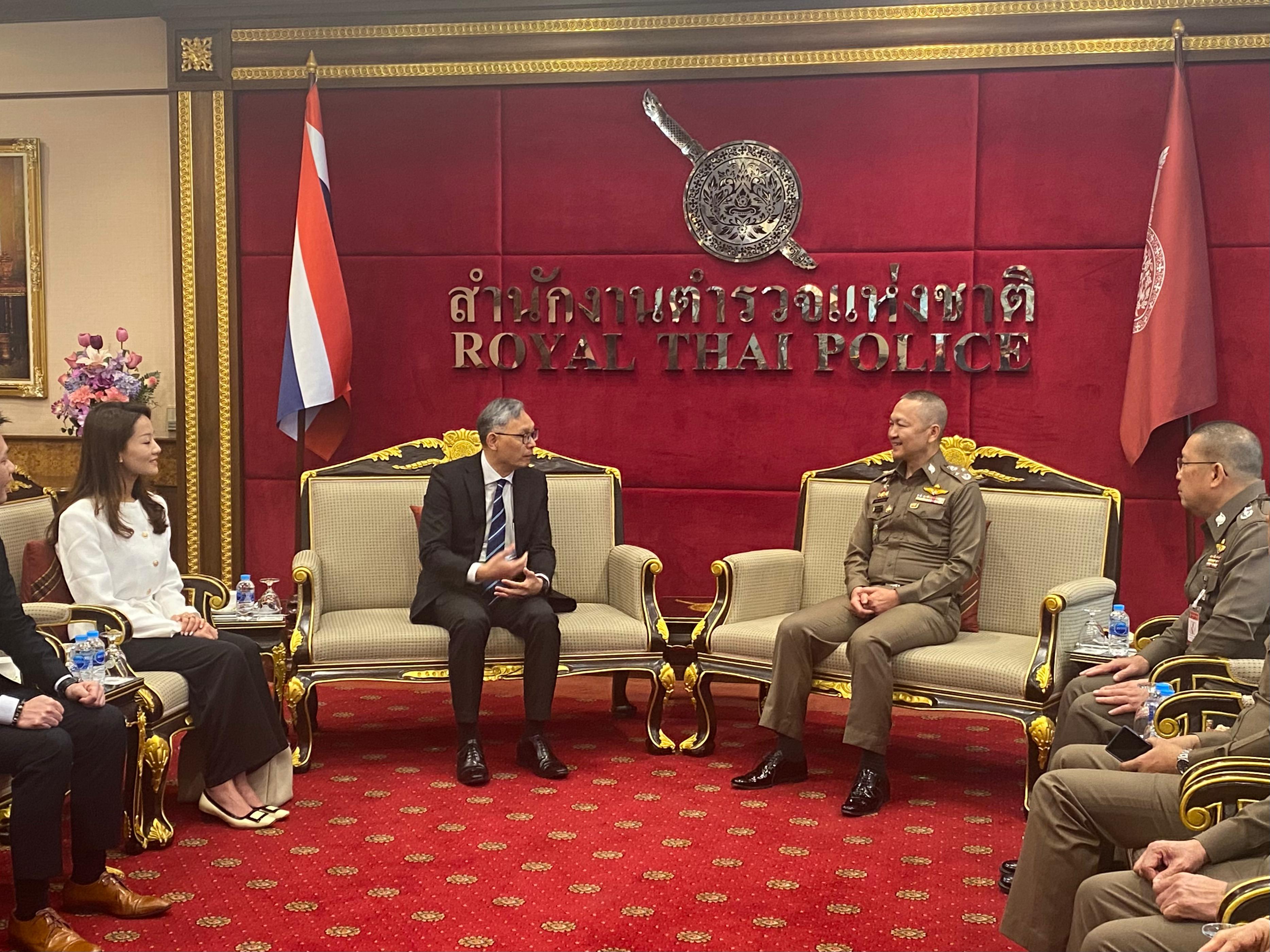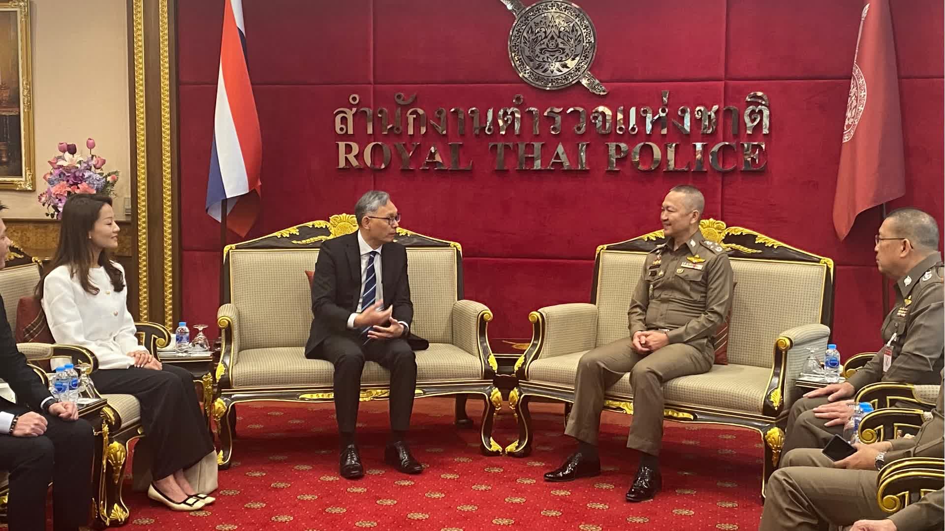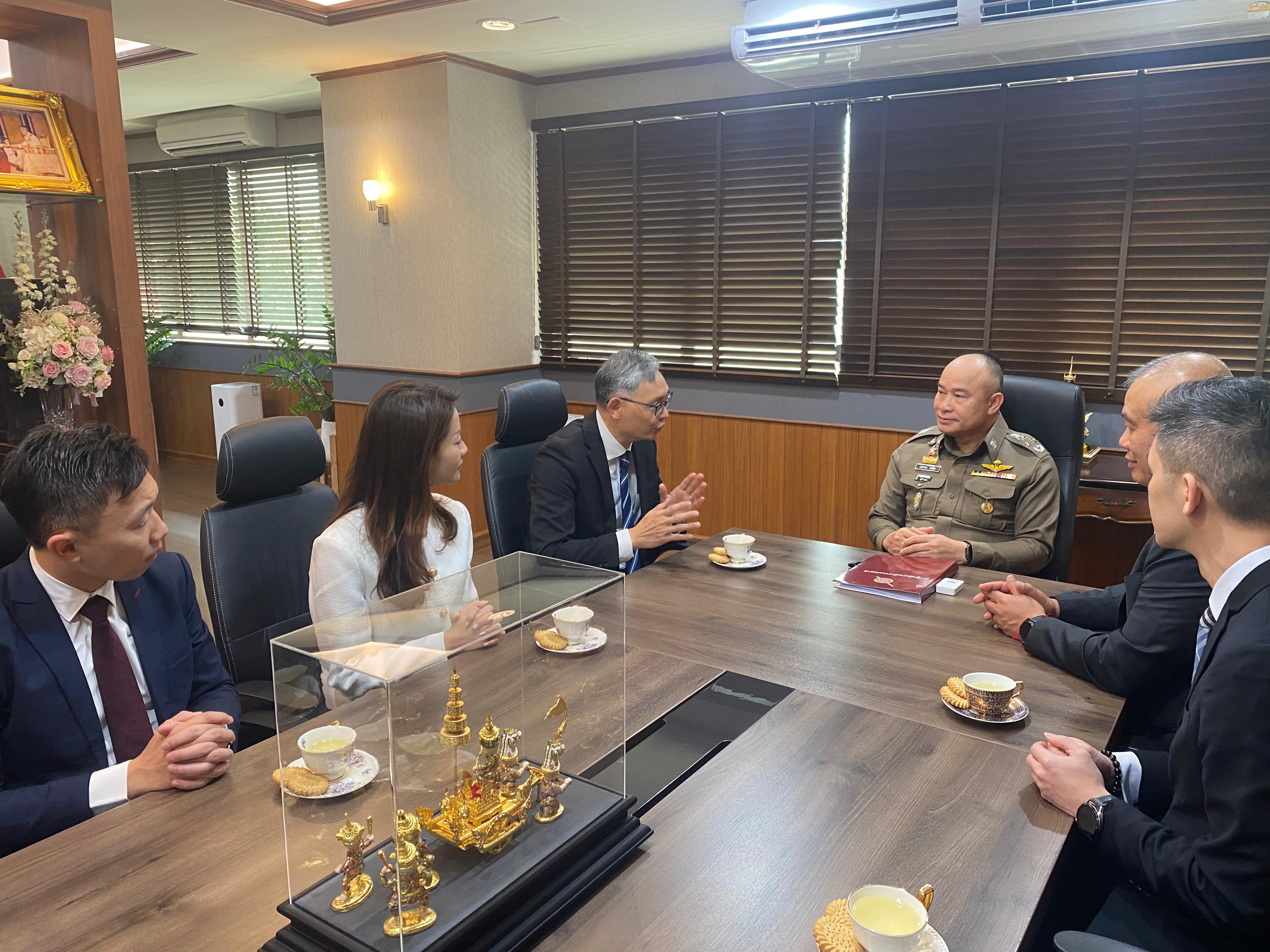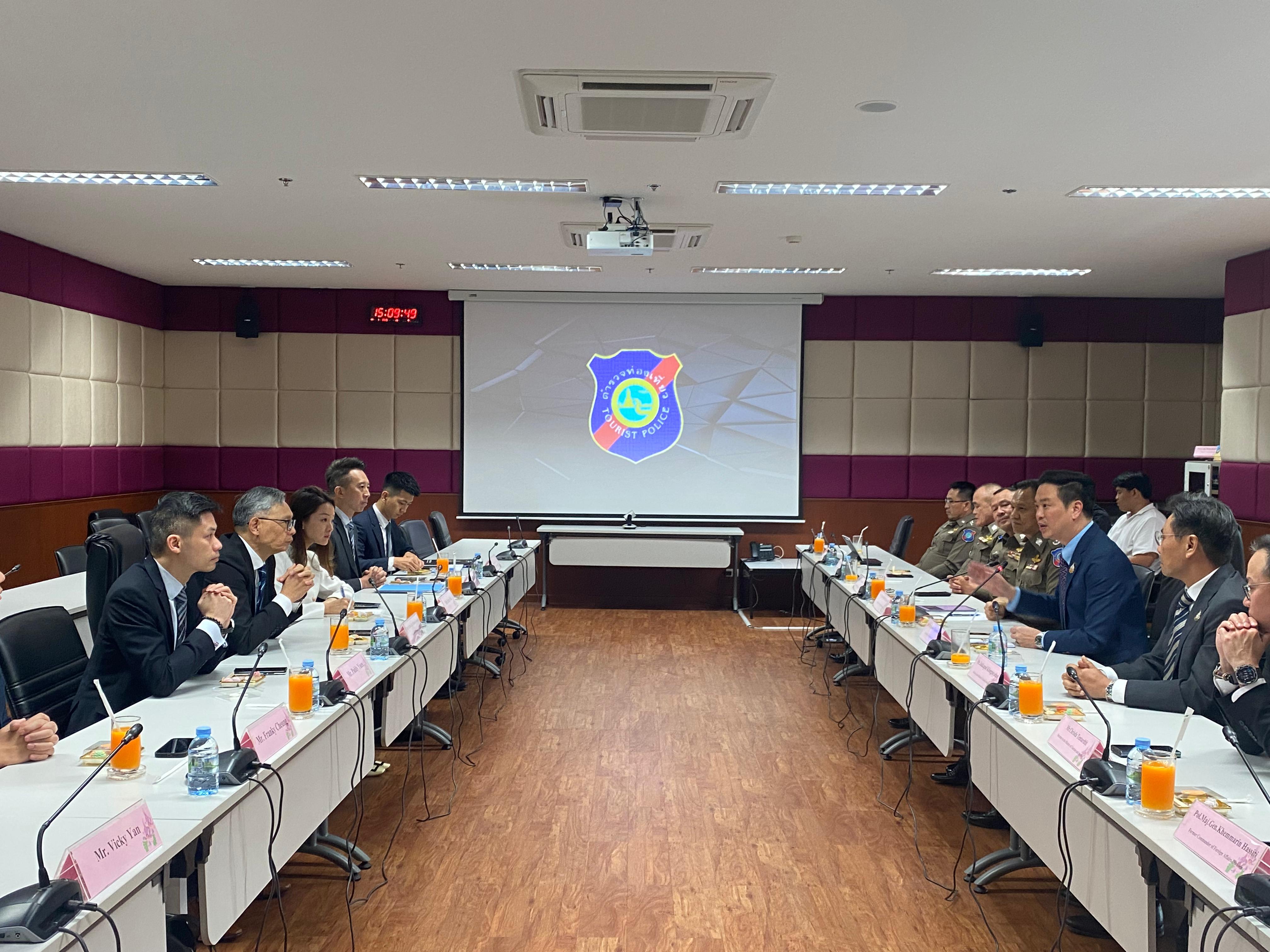專責小組一行人隨後與泰國國家警察副總長(防止及打擊罪案)Prachuab Wongsuk會晤,反映有關求助個案情況,雙方就進一步加強合作,共同打擊電信網絡詐騙、人口販運等跨境犯罪問題深入分享經驗和交換意見。