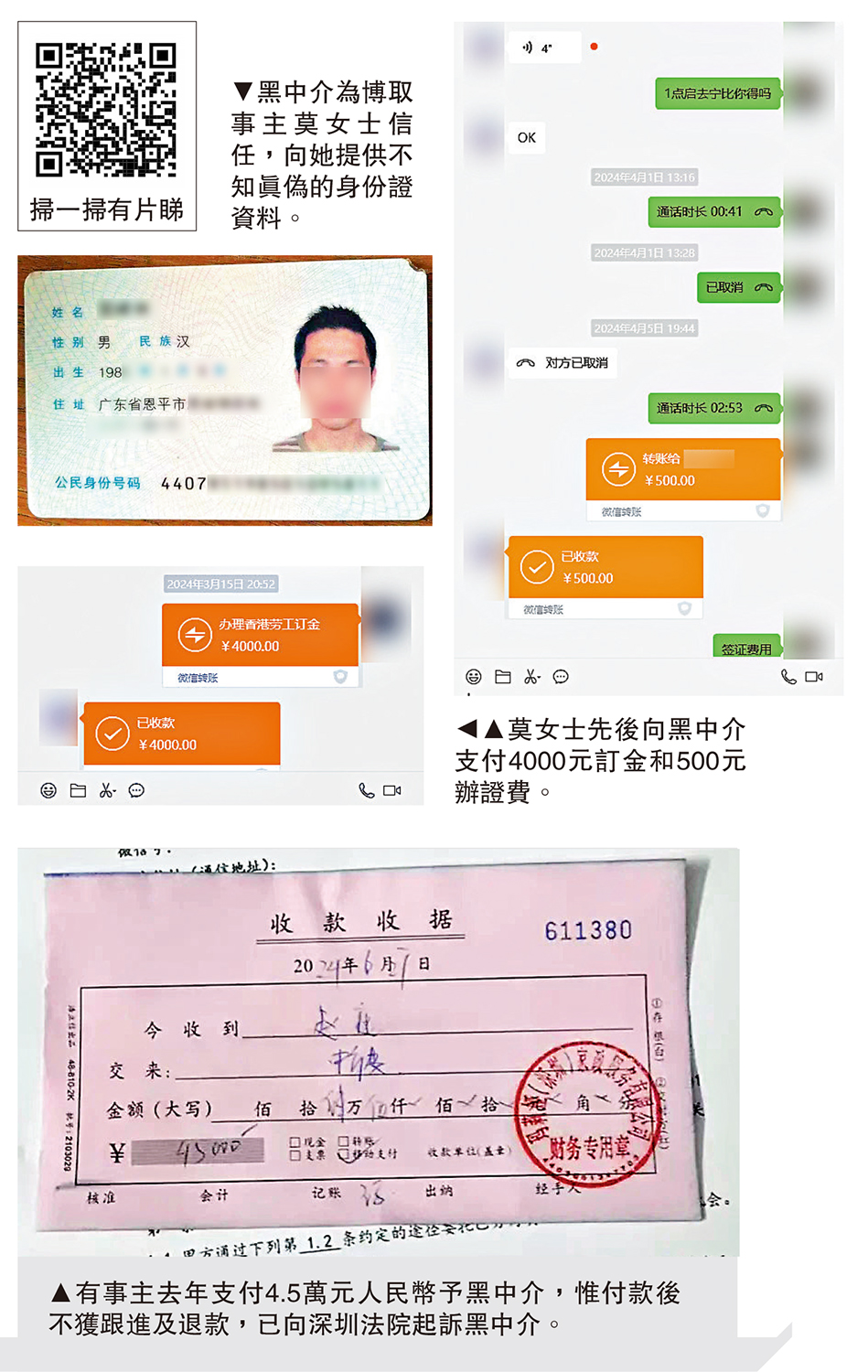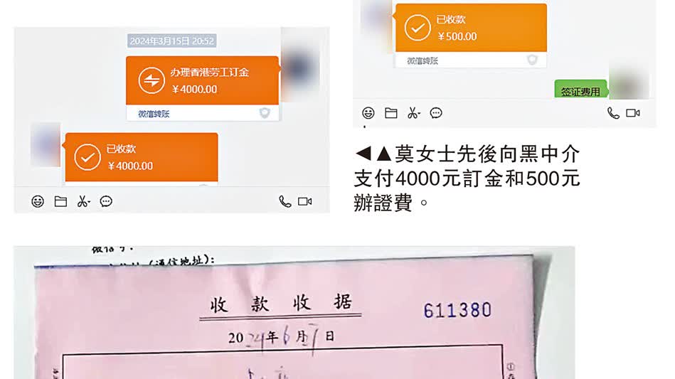 讀者莫女士向大公報記者講述被黑中介詐騙的過程。2024年年初,莫女士通過一位非常熟悉的朋友介紹,認識了一名據稱能幫忙介紹到香港工作的中介,因為對方與莫女士的這位朋友關係也非常密切,莫女士對其很信任。該名中介承諾要給莫女士介紹一份香港的水電工的工作,月薪為18000至23000元,在五個月左右就能完成所有手續。