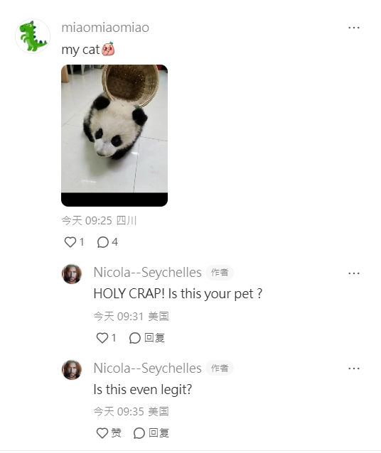 還有中國網民為了搞笑,在一條「交貓稅」帖文的評論區發布了一張大熊貓的照片,並說道:「my cat(我的貓)」。而初來乍到的美國網民則信以為真,驚歎道:「HOLY CRAP! Is this your pet?(這是你的寵物嗎?)」,隨即又半信半疑地追問:「Is this even legit?(這合法嗎?)」