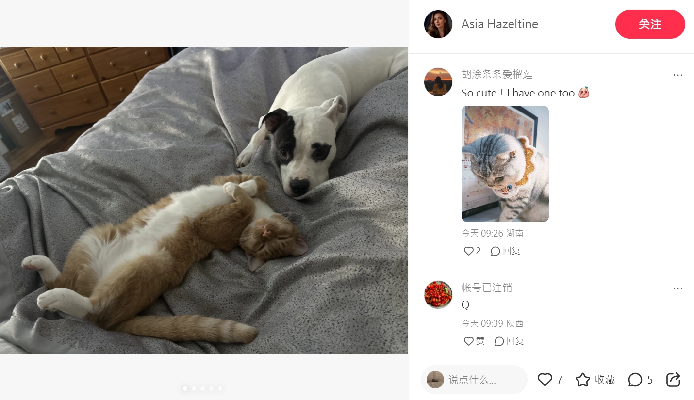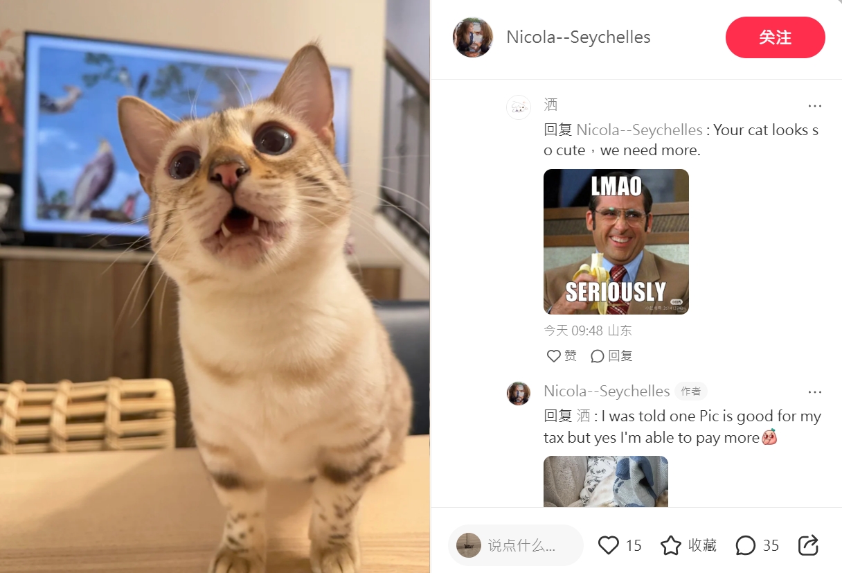 當不知道聊些什麼的時候,展示下自己的愛寵一般不會出錯。不少美國網民在小紅書發布的第一條帖文,都是自家貓咪的照片,這也被網民戲稱為「Cat Tax(貓稅)」。哪怕帖子主題和貓咪無關,「TikTok難民們」都能通過發布貓咪圖片獲得上千點讚。小紅書帶圖評論的功能,也讓「交貓稅」變得很簡單。中美網民在評論區互相展示貓咪照片,一下子拉近了距離。除了貓咪,雙方還曬出了其他寵物,包括狗、馬、小倉鼠等。
