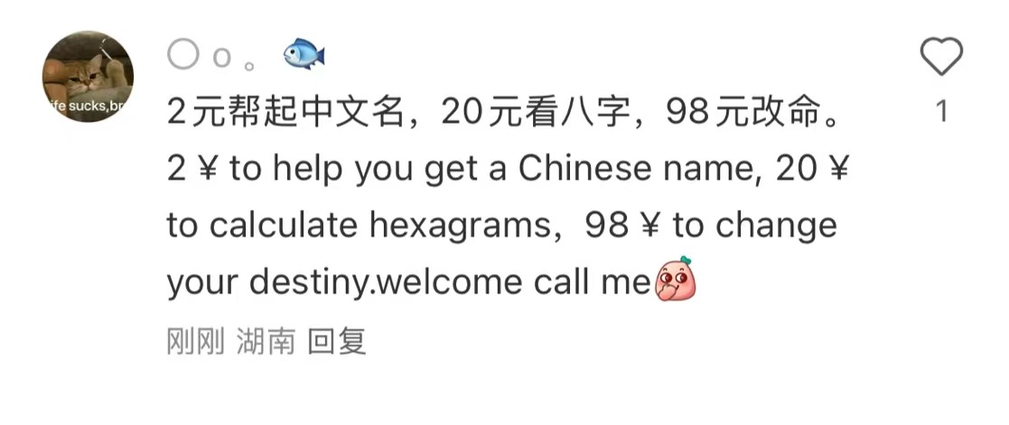 來到中國的社交平台,不少美國網民也想「入鄉隨俗」,改個中文名。有熱情的中國網民表示:「給我你的名字、期望或你的背景故事,我可以給你正宗地道的中文名,以幫助你融入這個社群。留下你的表情包,或者你的寵物、家鄉照片作為小費,多謝。」也有人順便將風水玄學這種「本土文化」帶給美國網民們:「2元幫起中文名,20元看八字,98元改命。」