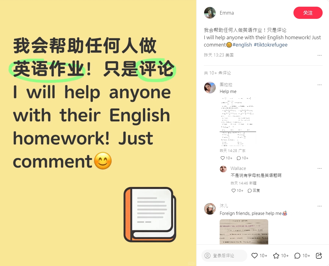 提高英語成績最快的方法就是交一個講英語的朋友。不少中國網民在小紅書發出了自己的英語作業,請美國網民幫忙解答,包括語法題、閱讀理解題、完形填空題等題目。更有美國網民主動請纓,「我會幫助任何人完成他們的英語作業」。