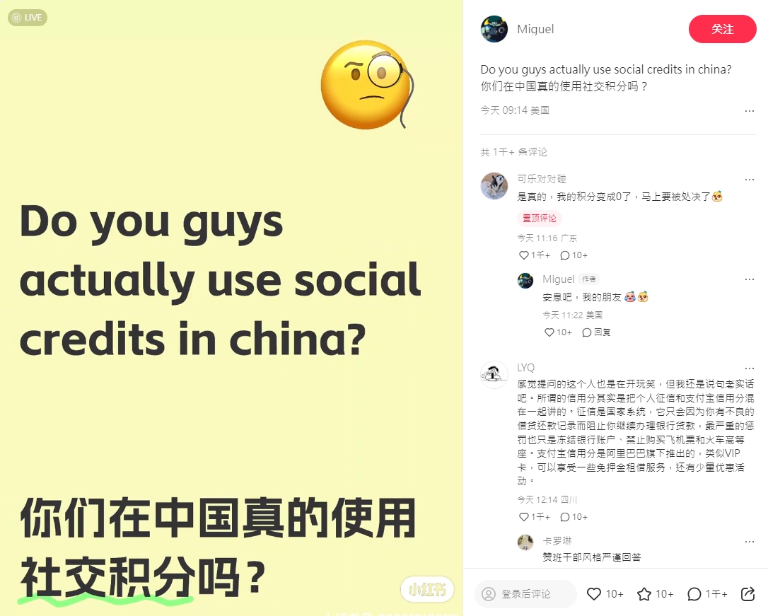 許多美國網民對中國的一切充滿了好奇,有人用了上翻譯器,以中文或者中英雙語發帖,希望和「原住民們」多聊聊。比如,「中國政府用社會信用積分區分『好公民』和『壞公民』」,就是不少西方媒體大肆渲染的虛假信息,聲稱中國公民的每個行為,都會被政府打分。面對「TikTok難民」的提問,有人認真解答,破除迷思;也有人開玩笑指「是真的,我的積分變成0了,馬上要被處決了」。