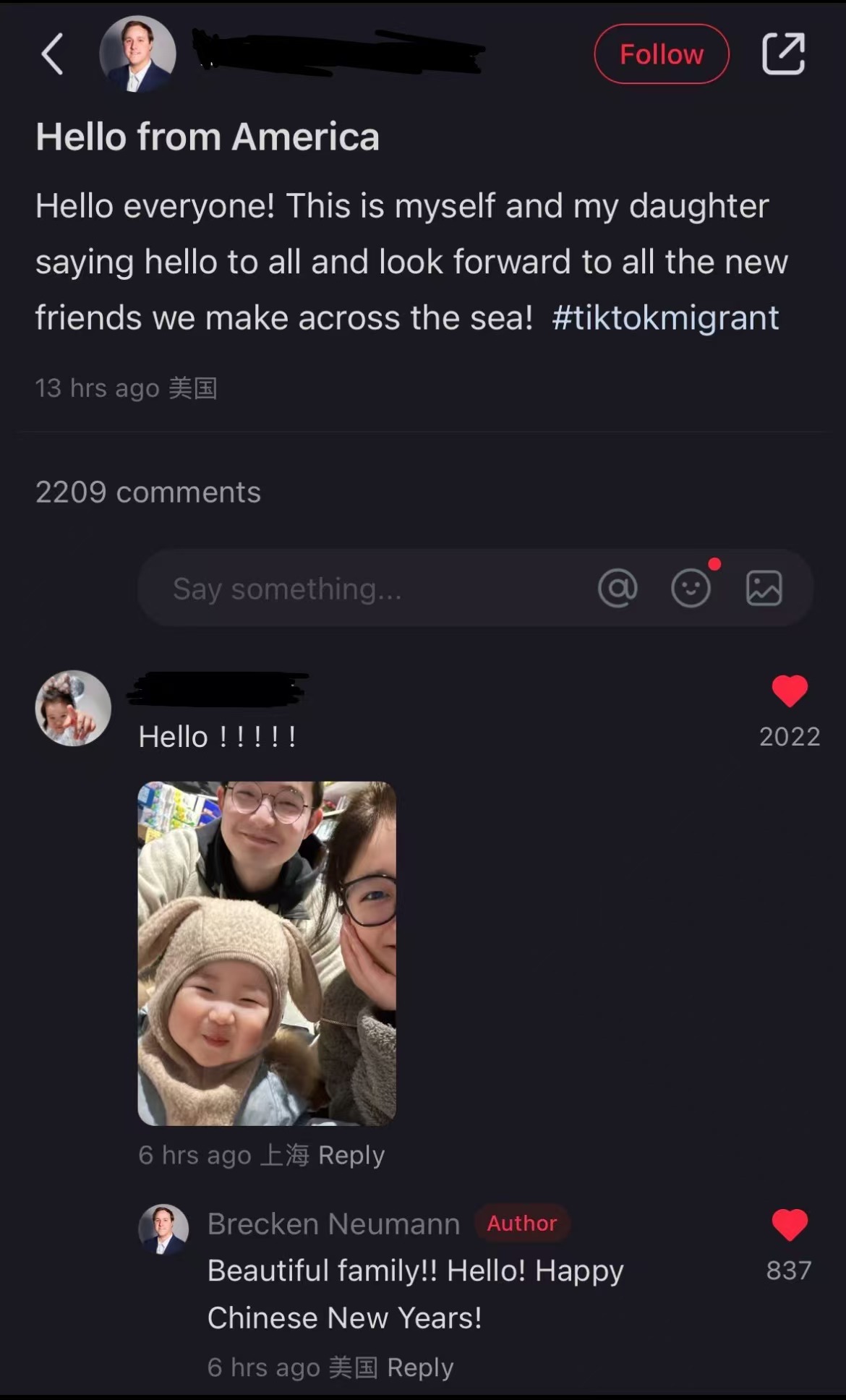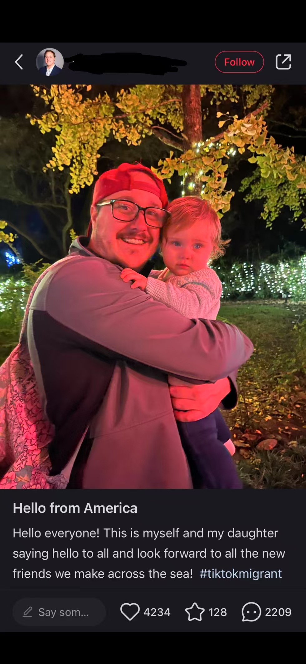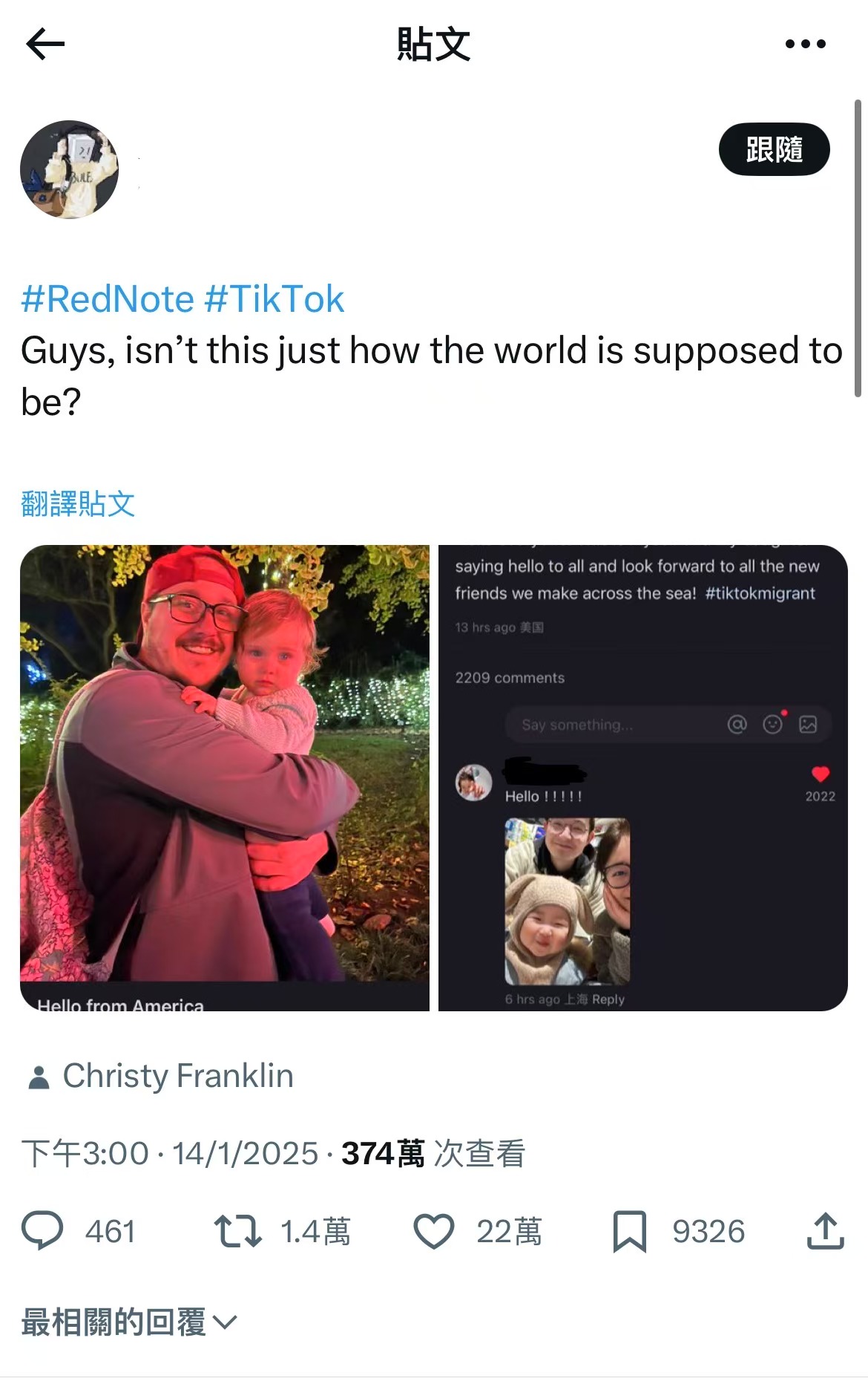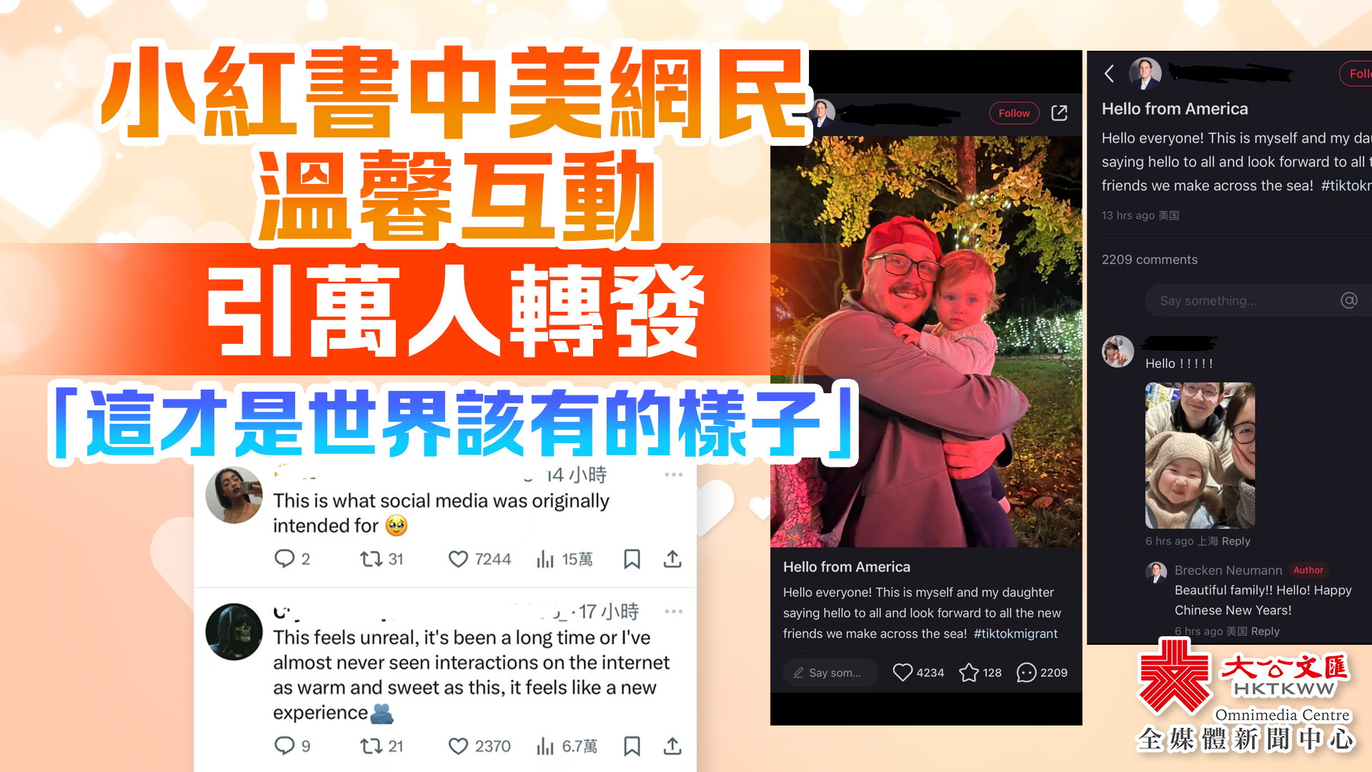 在美國社交平台上,一則搬運自小紅書的帖子引來1.5萬人轉發,並收穫了22萬人點讚。在兩張圖片裏,第一張是一位美國父親抱着自己的孩子,向中國網友打招呼:「來自美國的問好(Hello from America)。」在評論區下,中國網友發出自己的一家三口照片,並熱情地回覆「你好!!!!!(Hello!!!!!)」而搬運這則小紅書帖子的美國網民配文:「各位,這難道不是世界應有的樣子嗎?」瞬間引來無數人的共鳴。