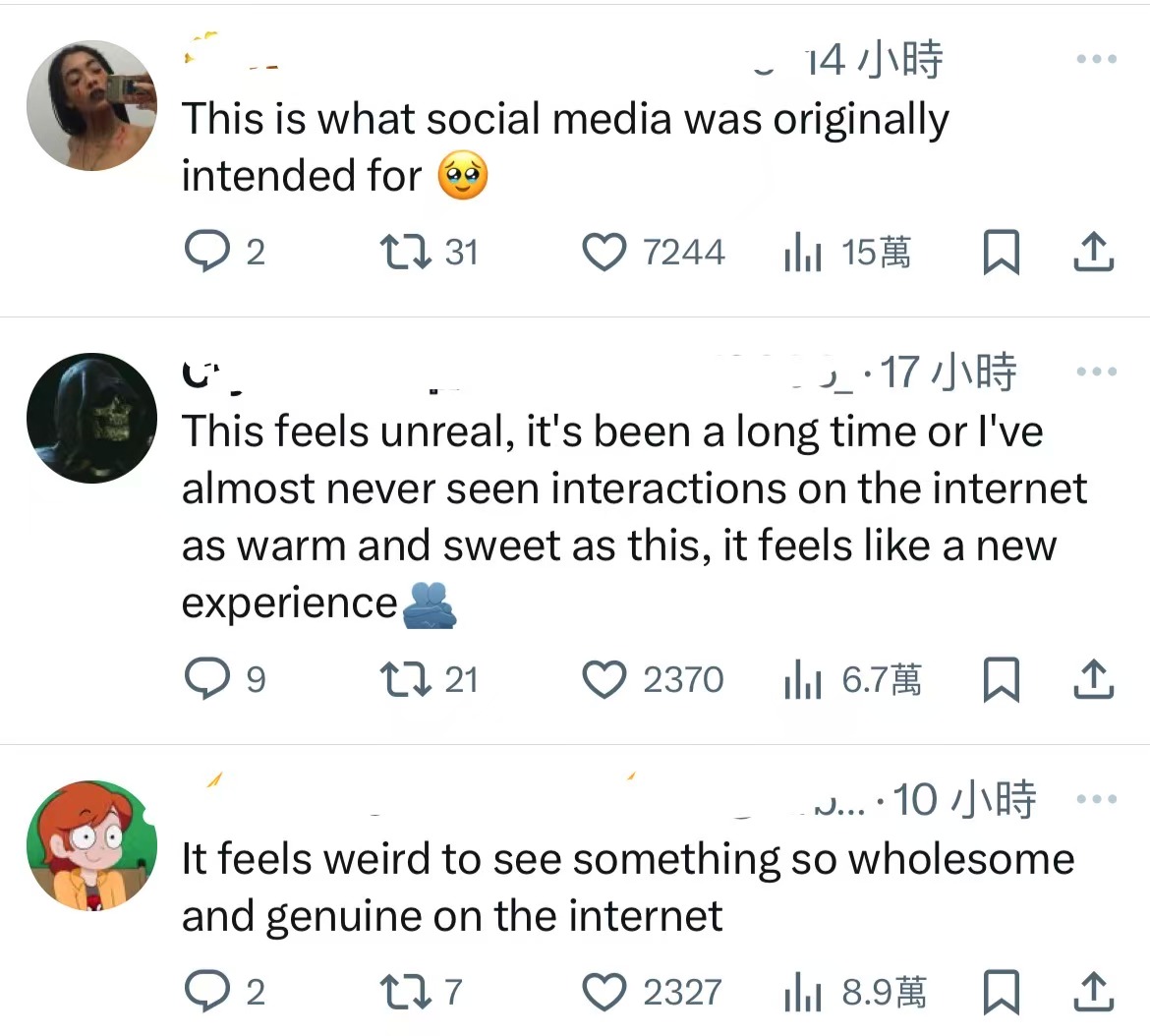 有網友表示,「這是社交媒體的初衷」並配上感動落淚的表情;有被不友善的網絡環境荼毒太久的網友表示,「在網上看到這樣溫馨的畫面實在是太不真實了」「在網上看到這樣健康而真實的內容,感到很奇怪」。有中國網民則表示,為中美網友的友好互動落淚,「不知道還有多少人記得,互聯網誕生時,第一句話就是『hello world』。」
