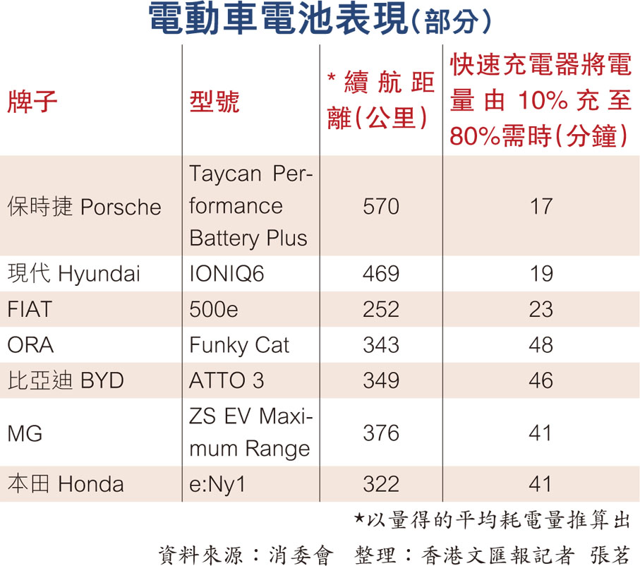 《選擇》月刊引述「國際消費者研究及試驗組織」與歐洲汽車會就19款電動車的測試報告,發現電量由10%快速充電至80%,電動車所需的充電時間介乎17分鐘至48分鐘不等,相差31分鐘。外國測試又顯示,電動車充電池容量與續航力未必成正比,例如一款聲稱充電池容量105.7千瓦小時的電動車,根據平均耗電量推算出的續航距離為546公里,在全部樣本中排行第三,另一款聲稱電池容量只有90.6千瓦小時的電動車,反而推算出的續航距離有559公里。