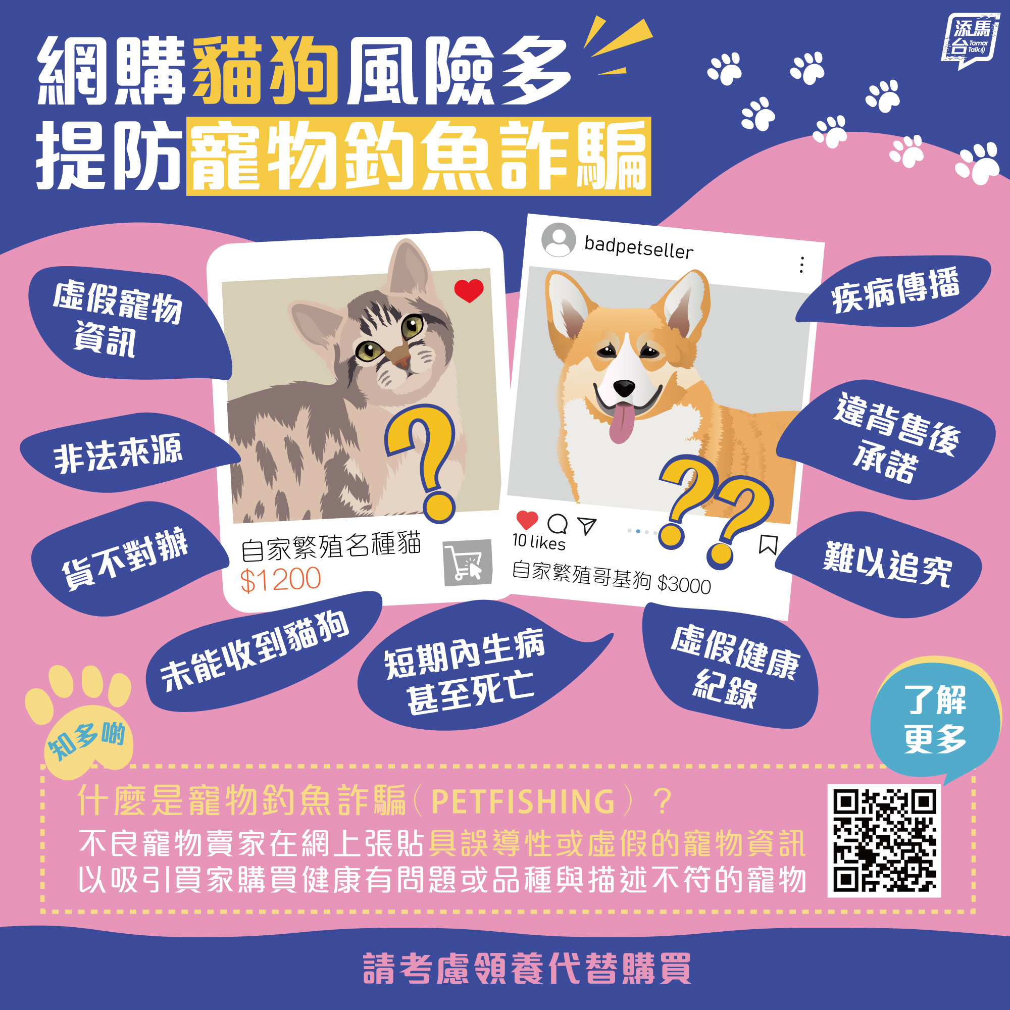 帖文指出,有不良寵物賣家在網上張貼虛假寵物資訊,以吸引買家購買健康有問題或品種與描述不符的寵物。買家不僅有機會蒙受金錢損失,當中更有寵物到家後不久便患病甚至死亡,賣家其後銷聲匿跡,更難以追究責任。此外,涉及聲稱「自家繁殖」的寵物網購騙案,大多是無牌售賣,不但風險高,動物福利亦完全不受保障。