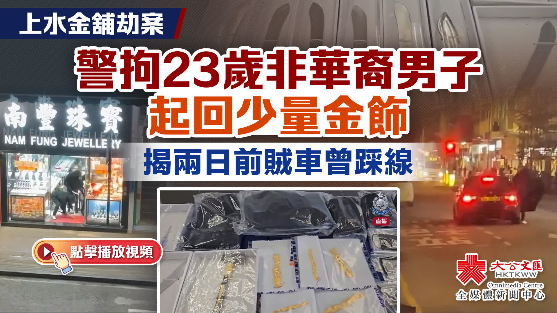 大公文匯全媒體報道,上水新豐路「南豐珠寶」昨(15日)晚遭遇搶劫案,4名蒙面賊人掠去一批金器後,登乘黑色寶馬私家車逃去。警方今日(16日)凌晨於八鄉拘捕一名23歲非華裔男子,並起回約10件金飾。警方表示,正追緝其餘涉案人士,經初步調查相信全部為非華裔人士。該名被捕男子被暫控一項搶劫罪,案件將於本周六(1月18日)在屯門裁判法院提堂。