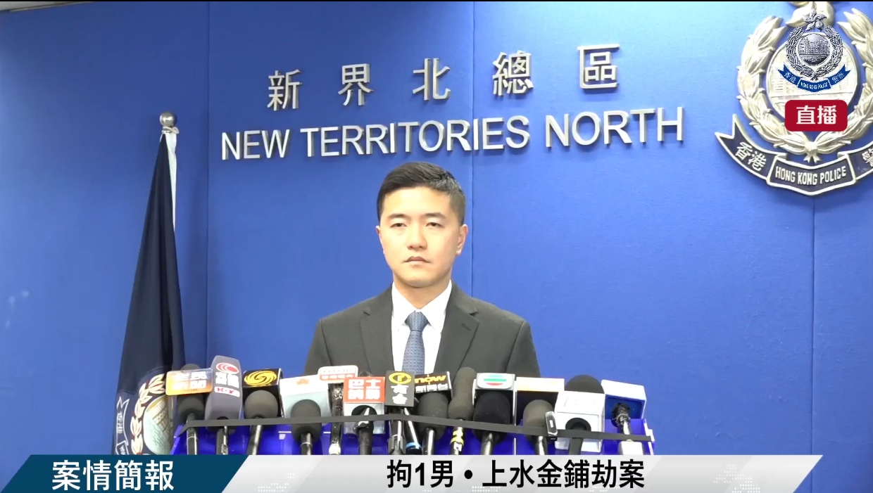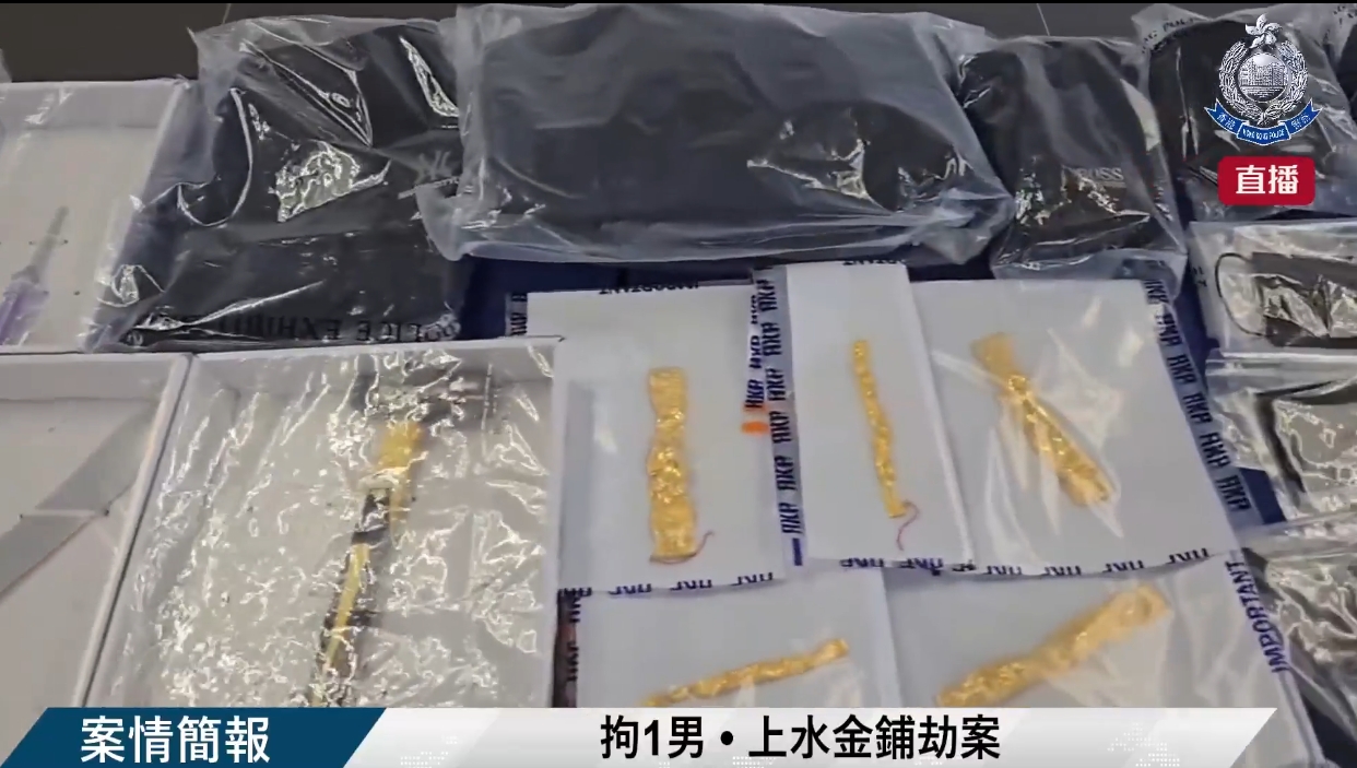 警方指,案發昨日傍晚,上水一間金舖遭4名蒙面人搶劫,賊人用鐵錘打爛金舖櫥窗及飾柜,並用利刀指嚇店員,之後在金舖大肆搶掠,案發期間盜取總值超過150萬元金飾。賊人得手後登上接應私家車向錦田方向逃去。警方續指,涉事私家車在林錦公路同另一輛私家車相撞,賊人落車逃去無蹤,車上遺下作案時利用的利刀及鐵錘,人員經搜索後在附近山邊找到賊人遺下的衣物及口罩。事故中一名無辜男司機受傷,報稱頸部受傷,須留院治理。