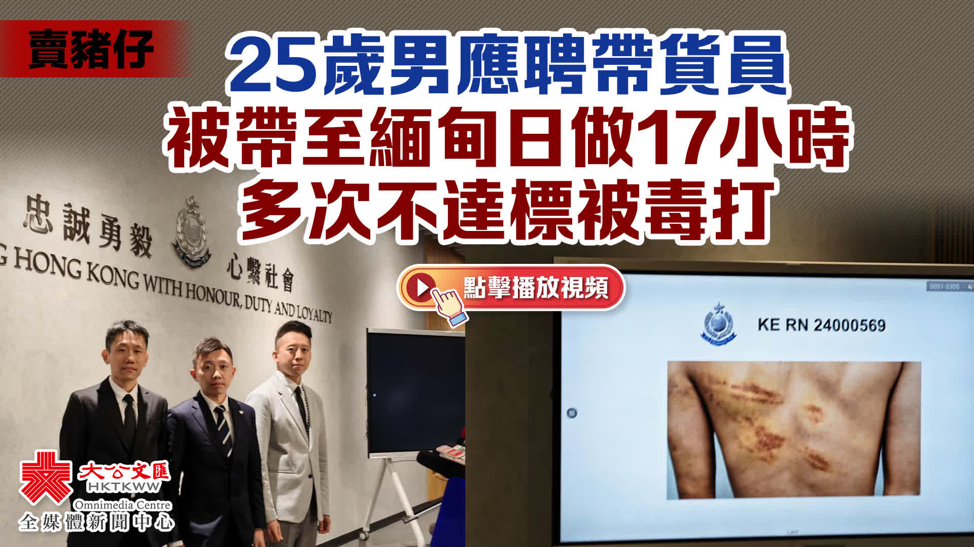 劉浩德指出,受害人10月初在社交媒體發現有人以港幣12萬元招聘帶貨員,從泰國帶鑽石到台灣。受害人應聘後,在2024年10月13日凌晨時分,經香港機場前往泰國曼谷,據受害人描述,當他同日早上抵達曼谷機場後,隨即被當地人安排上了預先安排的私家車,之後幾小時多次被安排轉乘不同車輛,當他到泰緬邊境後警覺受騙,曾嘗試逃走但失敗,之後被帶到緬甸一個山上的園區,園區內有軍人持槍巡邏。到達園區後,受害人被逼透過社交媒體進行網上騙案,每日工作時間長達17小時,由早上做到半夜,受害者過去3個月未符合工作目標,多次被人毒打及扣除膳食,現在身體上仍見到很多傷痕。