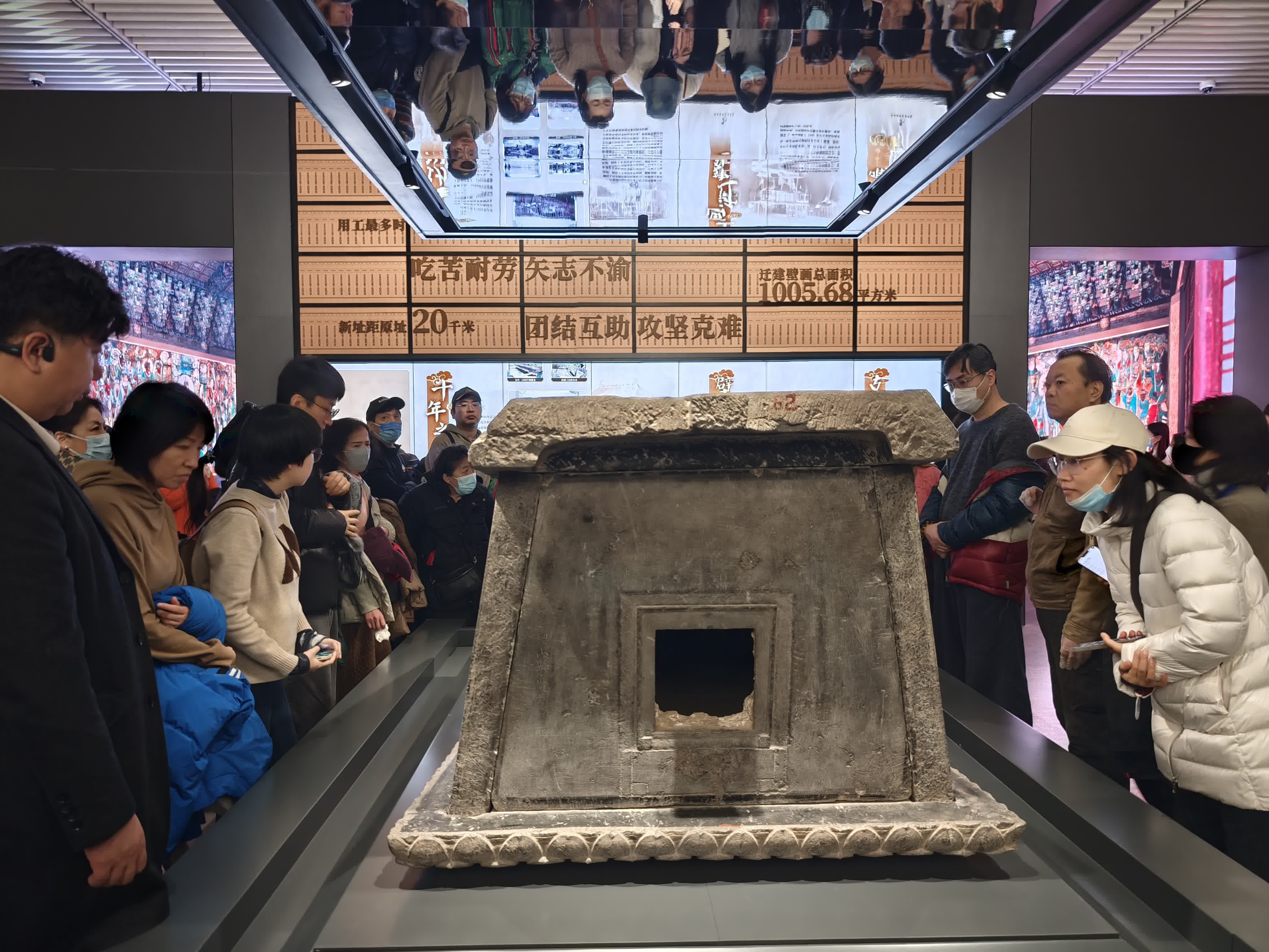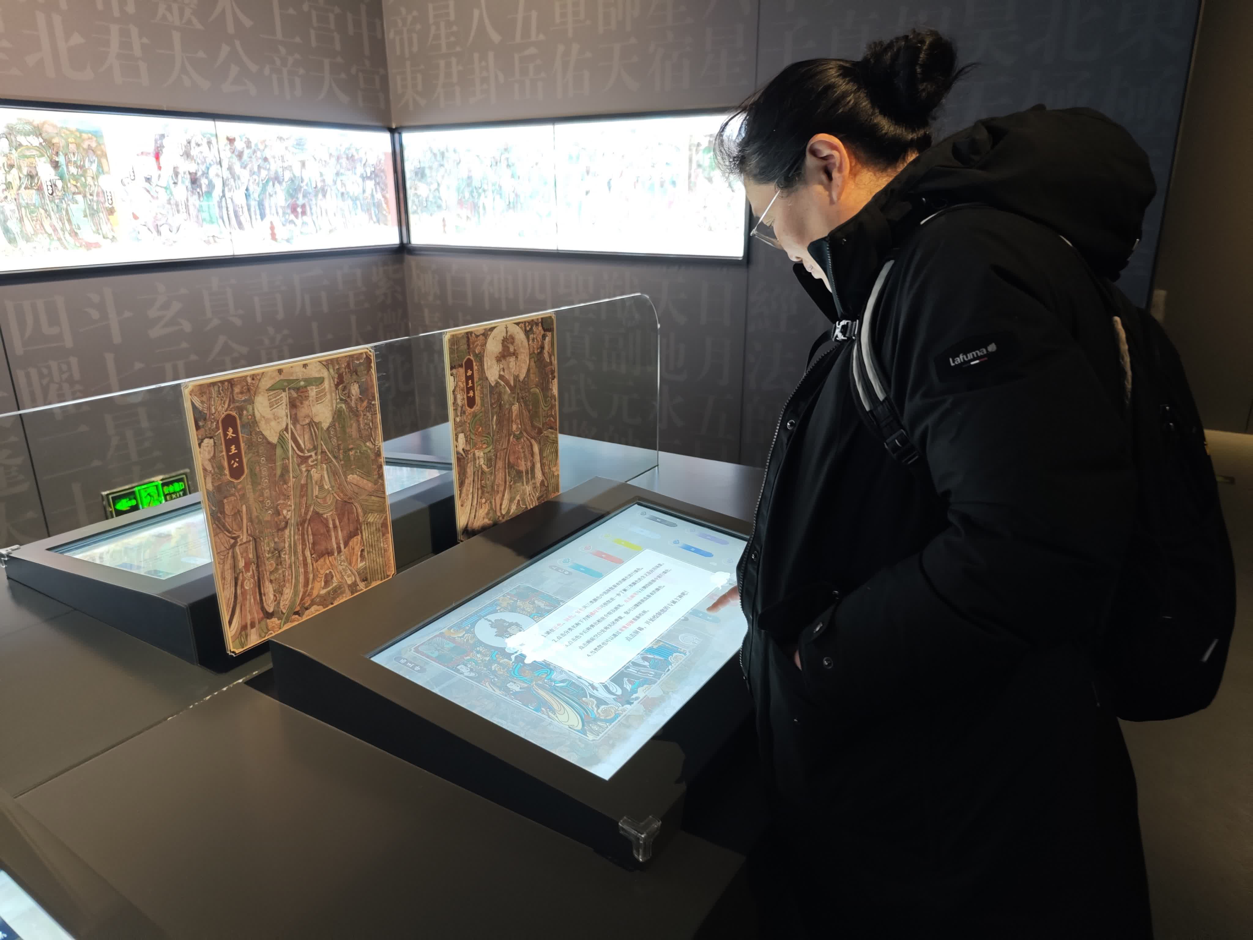 展覽通過「蔚為大觀」「和光同塵」「壁上乾坤」「山河永存」4個部分展開敘事,並引入「幻遊永樂」虛擬現實沉浸劇場。山西省古建築與彩塑壁畫保護研究院副院長安海在接受訪問時介紹,展覽從一塊磚開始,到一塊磚結束。一進門,觀眾迎面便能看到一塊地磚,它來自永樂宮主殿三清殿,磚面刻有的文字記載了三清殿完工的確切日期。展覽尾聲則陳列了一塊三清殿手印磚。他解釋稱,元代實行「物勒工名」的制度,工匠在磚體燒造前會在磚體上留下手印,以備成品查驗。「我們在觸摸屏設計了『古今合掌』的互動項目,意在引導觀眾感受700多年的歷史傳承。」
