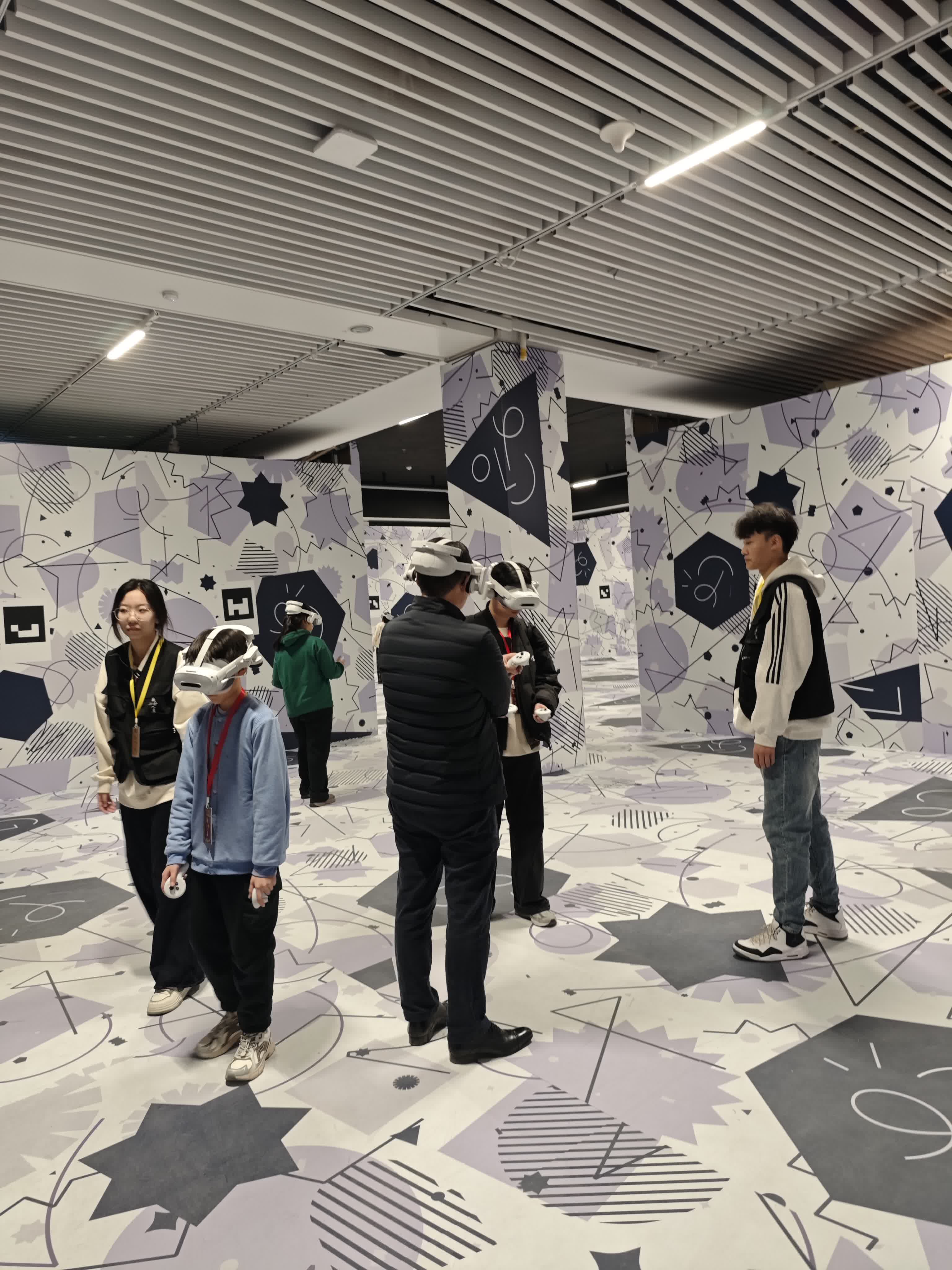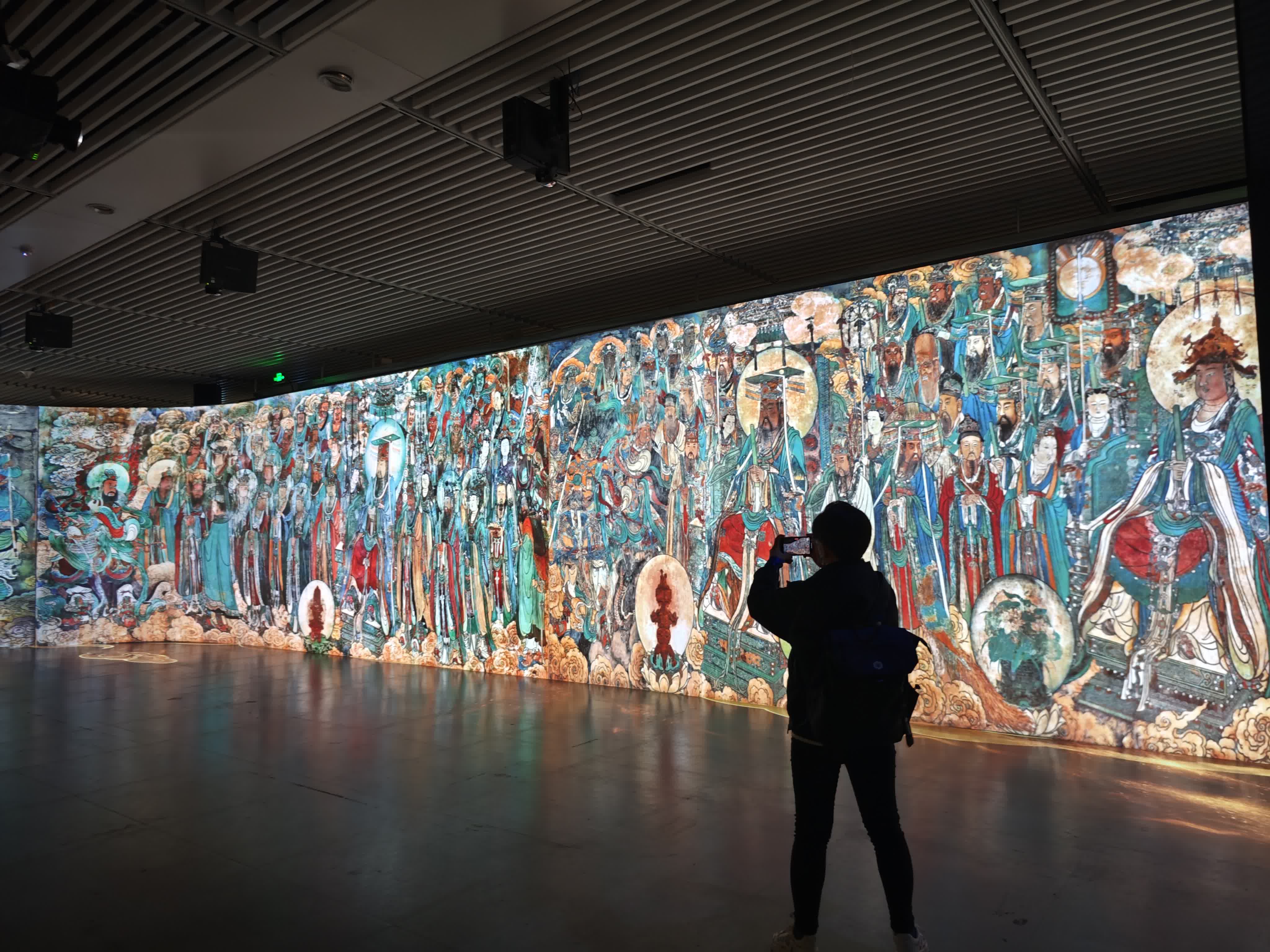 展覽特別打造了多處沉浸式互動體驗空間。北京吾仝科技有限公司總經理王筠介紹,行進式弧幕劇場生動再現三清殿壁畫《朝元圖》的恢弘場景,AI活化的三清殿神祇迎面「飛來」,讓觀眾感受「眾神朝元,滿壁風動」帶來的震撼。還引入VR大空間技術,觀眾佩戴VR設備後,即可步入「畫」中,破「壁」穿梭,通過純陽殿「遇仙於橋,廬山放生」壁畫故事開啟永樂宮的奇遇。