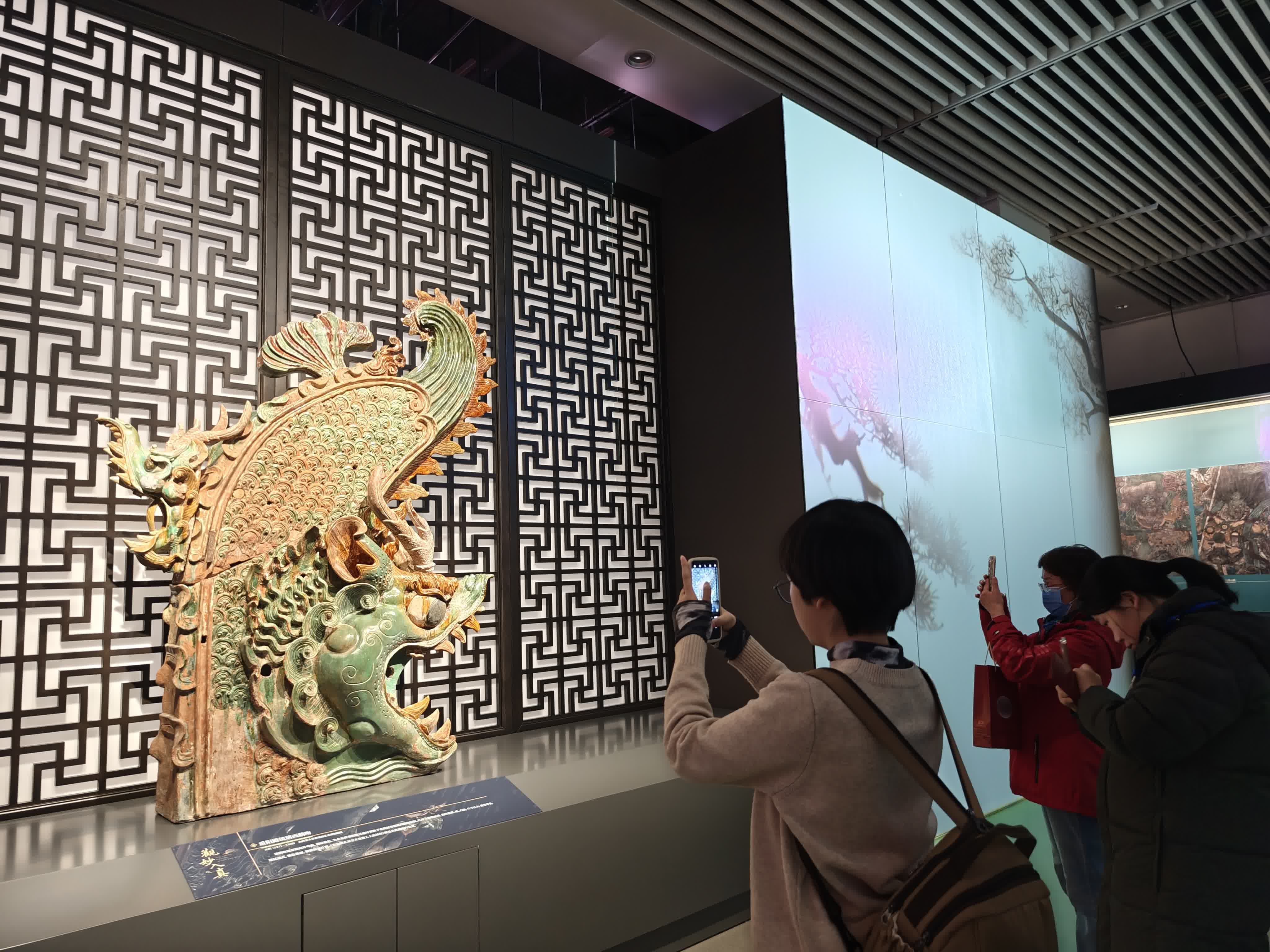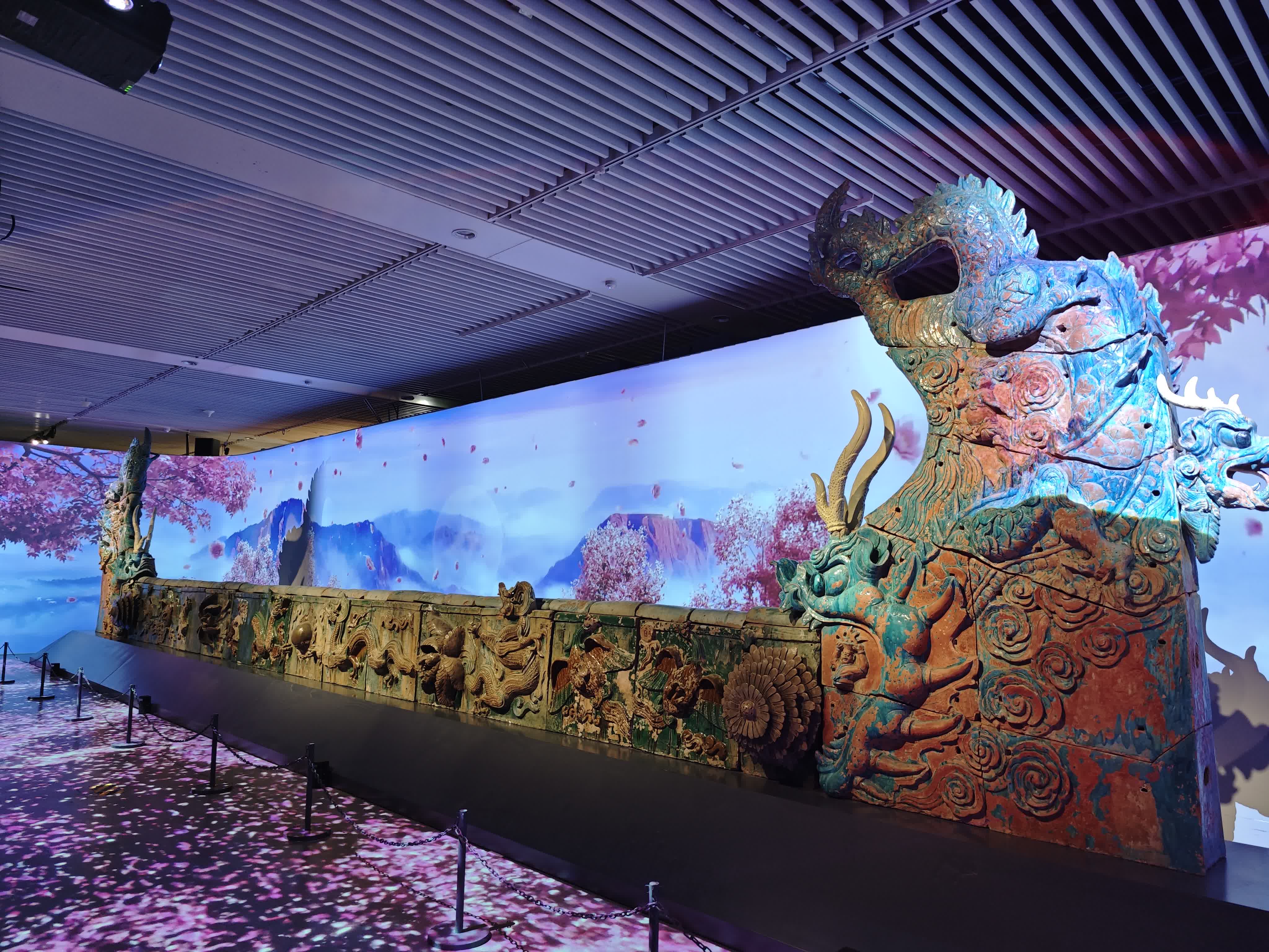 展廳內,一套三清殿屋檐頂端的琉璃構件盡顯永樂宮建築的壯美。這組構件由兩件琉璃鴟吻和一組屋頂正脊構成,長10餘米,釉色艷麗,造型華美。其中,南北兩端的兩件孔雀藍琉璃鴟吻,整體造型為巨龍盤曲樣式,鴟吻張口吞脊,怒目圓睜,炯炯有神。鴟吻與正脊連接處還塑有胡人獻寶、風伯雲紋等紋飾。安海告訴記者,「這組琉璃構件是遷建永樂宮時替換下來的,一直保存在永樂宮庫房裏,通過展覽得以同觀眾見面。」