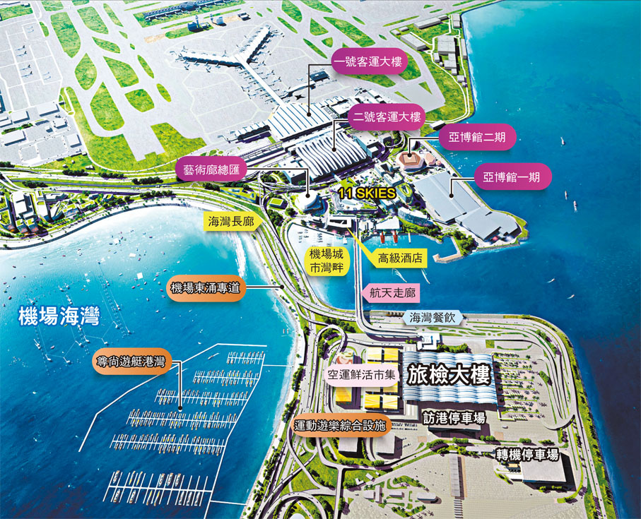 一號客運大樓和旅檢大樓之間的9公頃水域,將建造名為「機場城市灣畔」的遊艇度假碼頭,設70個長達35米遊艇泊位,結合大嶼山生態旅遊和深度遊。