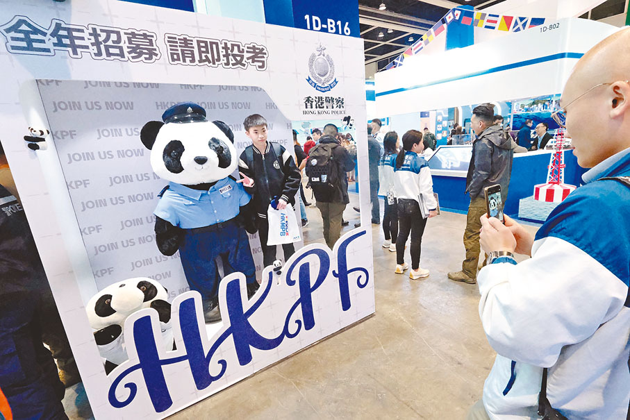 香港文匯報記者昨日上午到博覽會現場,見職業展區設置了公務員事務局、入境處、消防處等多個政府部門的攤位,吸引不少市民到來了解及進行查詢。