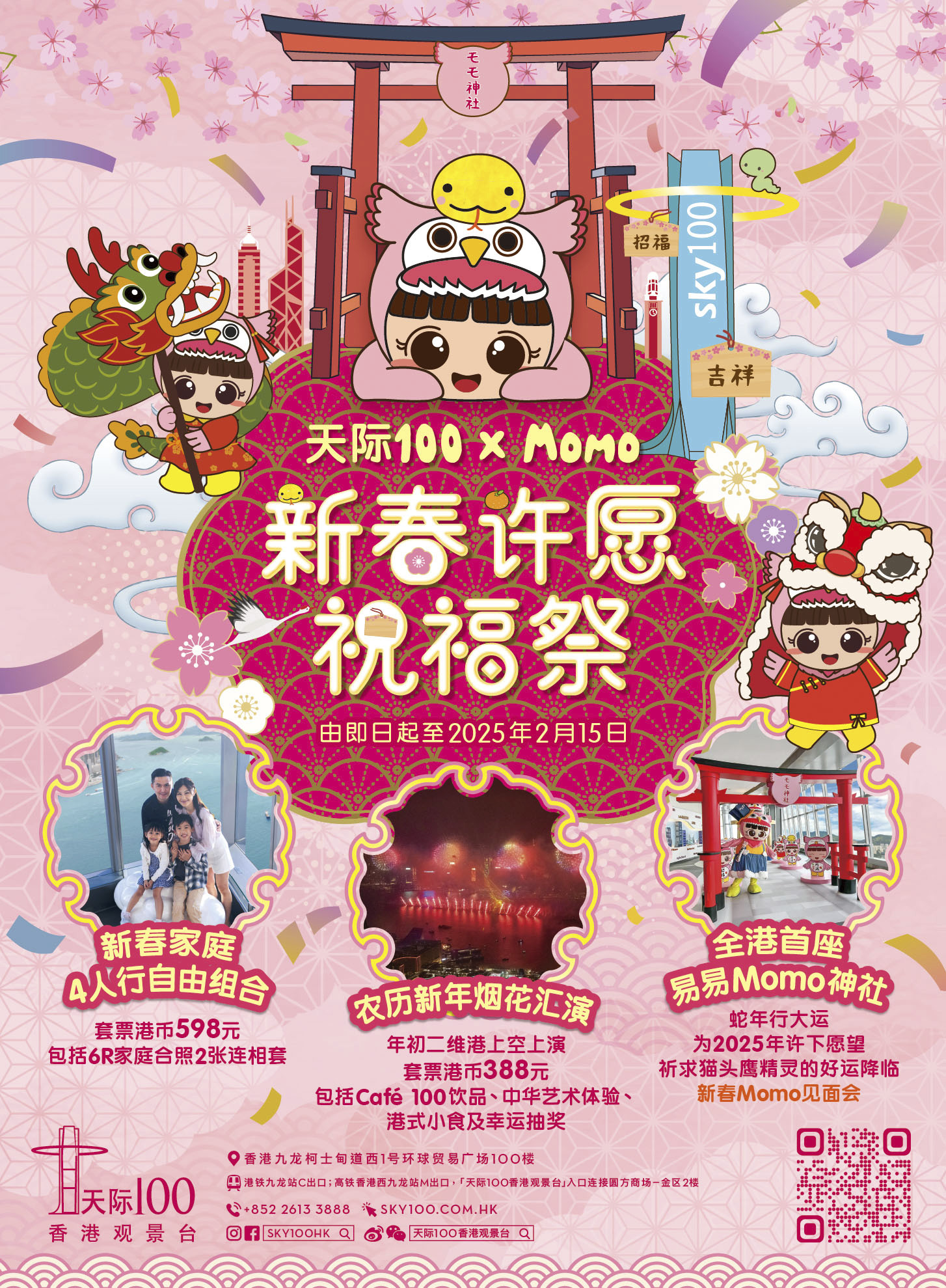 天際100於農曆新年期間,特意設置易易MoMo神社,讓訪客仿如置身日本,祈求新一年事事順景。神社的吉祥物是招福精靈易易MoMo,她常掛在口邊的口頭禪「咕咕咕」跟日文「不苦勞」的發音相似,象徵對新年的期盼,在蛇年給大家帶來正能量。