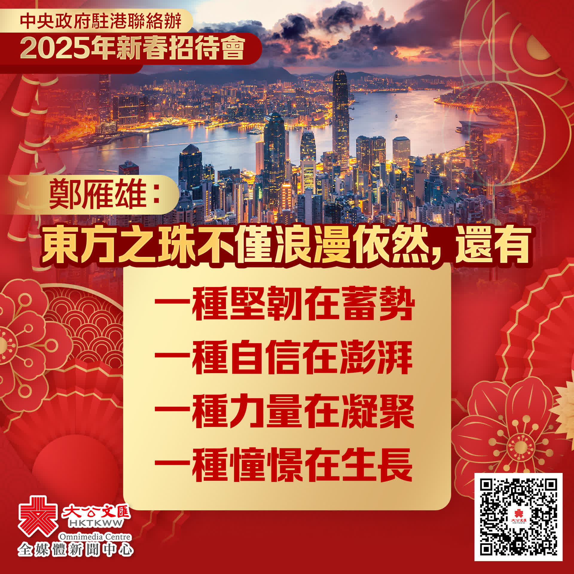 鄭雁雄指,在唱響《龍的傳人》的香港,2024龍年同樣留下很多珍貴畫面、美好記憶。令人備受鼓舞的是,習近平主席給祖籍寧波的香港企業家回信,極大鼓舞了香港工商界和社會各界支持特區建設、推動由治及興的決心和幹勁。令人深感欣慰的是,基本法第23條本地立法取得全民支持、全程順利、全票通過的結果,香港終於補上了欠缺多年的安全短板。令人信心滿懷的是,李家超行政長官帶領特區政府擔當作為,香港經濟自由度再登全球榜首,世界競爭力上升至全球第五,國際金融中心地位重回世界第三,迎來逆勢復常的難得勢頭。令人倍感振奮的是,機場三跑道系統全面啟用,國際航空樞紐地位日益穩固,香港進入「三大國際中心+N」新時代。令人心潮澎湃的是,香港奧運健兒在巴黎勇奪男女雙金,聖保羅男女中學合唱團在新西蘭獲獎時高唱國歌,海洋公園大熊貓誕下龍鳳雙胎,寓意香港和美吉祥、龍鳳呈祥。令人感恩奮進的是,中央惠港政策陸續有來,多地「自由行」、深圳「一簽多行」和中央系列增量政策帶動香港旺丁旺財;航天英雄、奧運健兒、海軍艦艇訪港,大熊貓安安、可可加入香港大家庭,中央對香港的深情眷顧溫暖人心,家國情懷充盈香江。所有這些,都在宣告,東方之珠不僅浪漫依然,還有一種堅韌在蓄勢,一種自信在澎湃,一種力量在凝聚,一種憧憬在生長。