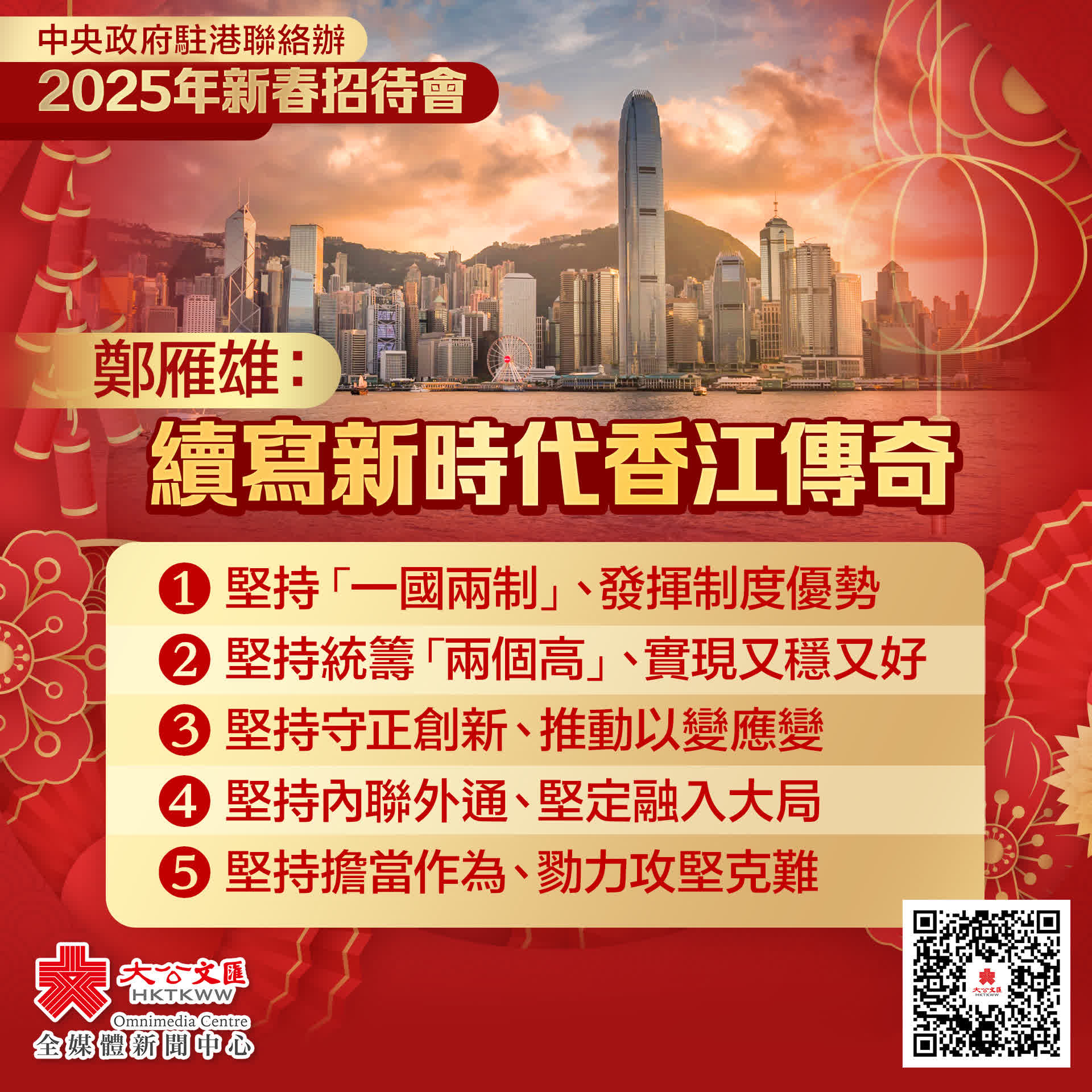 續寫新時代香江傳奇,需要我們堅持守正創新、推動以變應變。習主席強調,守正創新是進一步全面深化改革必須牢牢把握、始終堅守的重大原則。香港要維護「一國兩制」,要維護憲法和基本法確定的憲制秩序,要維護自由法治的營商環境和多元包容的人文環境,這都是守正。同時,要善於識變、應變、求變,在變中取勝。百年變局何嘗不是香港之機?何嘗不是香港可以用好的時與勢?有偉大祖國堅強後盾,有東方文化獨特魅力,有規則利益聯通西方,有「全球南方」新的舞台,有「一帶一路」橋樑紐帶,香港完全可以做到四方招財、八面來風,關鍵是要在守正創新中更好的成就自己。