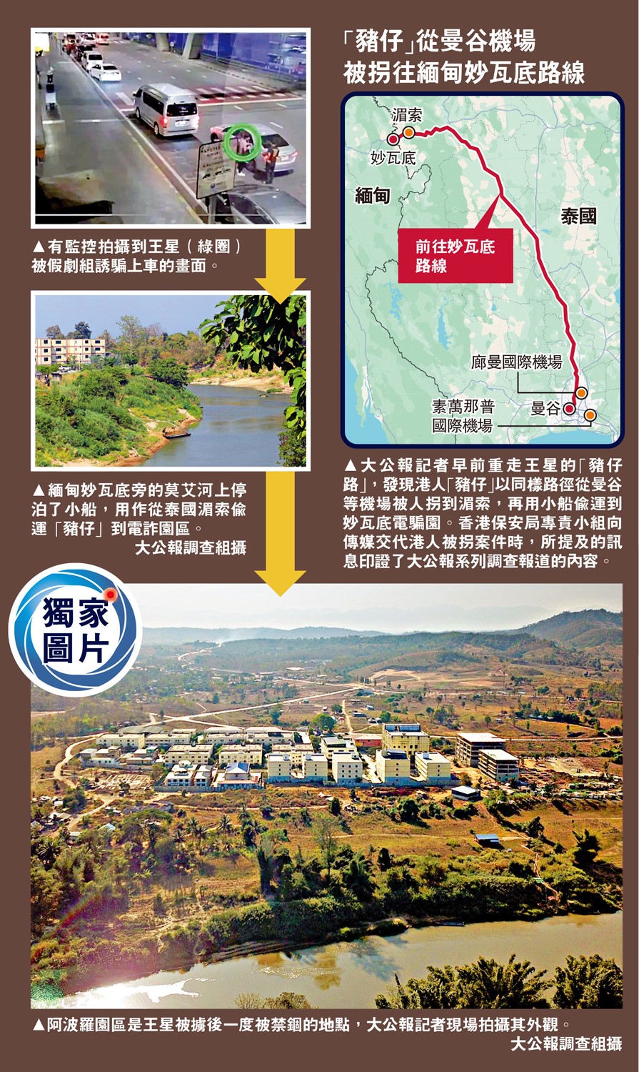 大公報記者順着河流北上,到達妙瓦底亞太城對岸,發現亞太城大致被劃分為生活娛樂區及工作區。工作區相當於電騙集中營,那邊營運模式與一般工業園類似,內有數十棟辦公樓,東主將辦公樓出租給不同的電騙公司。從妙瓦底過河而來的當地居民告訴大公報記者,內地演員王星被騙往的阿波羅園區,在那裏屬於小園區,不過事情搞大了,不得不放人。