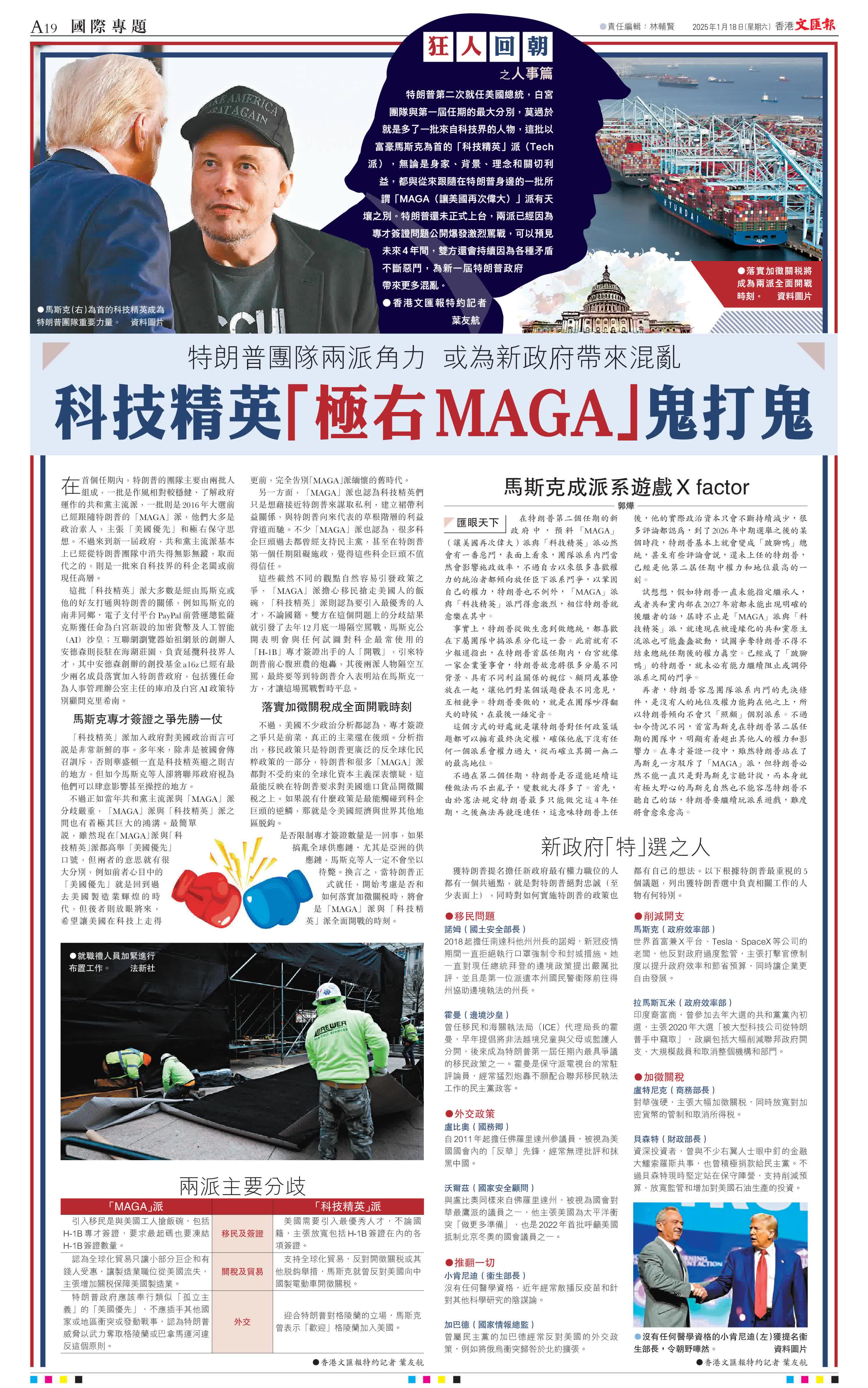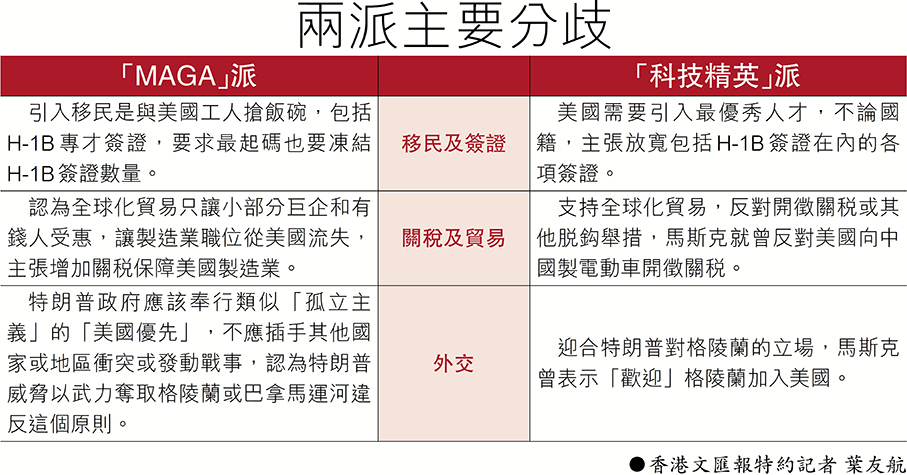 (香港文匯報特約記者 葉友航)特朗普第二次就任美國總統,白宮團隊與第一屆任期的最大分別,莫過於就是多了一批來自科技界的人物,這批以富豪馬斯克為首的「科技精英」派(Tech派),無論是身家、背景、理念和關切利益,都與從來跟隨在特朗普身邊的一批所謂「MAGA(讓美國再次偉大)」派有天壤之別。特朗普還未正式上台,兩派已經因為專才簽證問題公開爆發激烈罵戰,可以預見未來4年間,雙方還會持續因為各種矛盾不斷惡鬥,為新一屆特朗普政府帶來更多混亂。