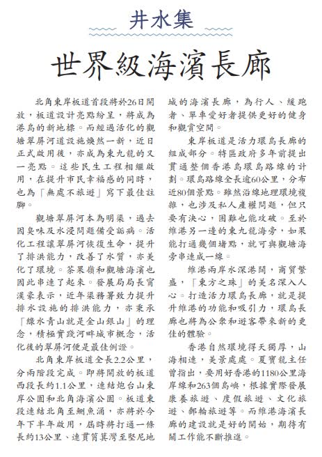 北角東岸板道首段將於26日開放,板道設計亮點紛呈,將成為港島的新地標。而經過活化的觀塘翠屏河道設施煥然一新,近日正式啟用後,亦成為東九龍的又一亮點。這些民生工程相繼啟用,在提升市民幸福感的同時,也為「無處不旅遊」寫下最佳註腳。