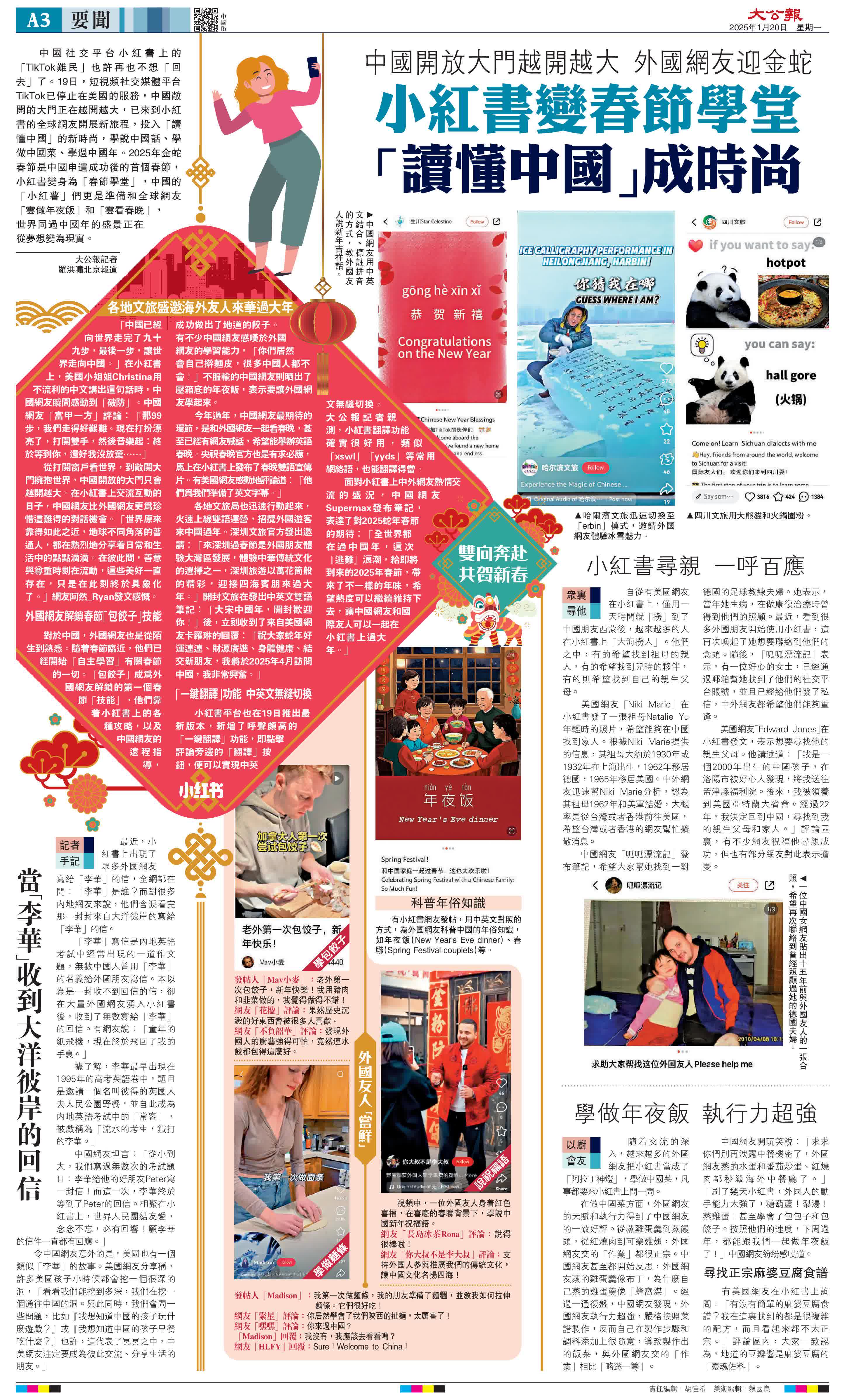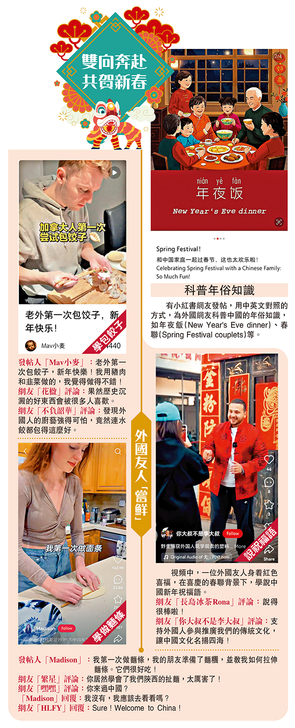 (大公報記者 羅洪嘯北京報道)中國社交平台小紅書上的「TikTok難民」也許再也不想「回去」了。中國敞開的大門正在越開越大,已來到小紅書的全球網友開展新旅程,投入「讀懂中國」的新時尚,學說中國話、學做中國菜、學過中國年。2025年金蛇春節是中國申遺成功後的首個春節,小紅書變身為「春節學堂」,中國的「小紅薯」們更是準備和全球網友「雲做年夜飯」和「雲看春晚」,世界同過中國年的盛景正在從夢想變為現實。