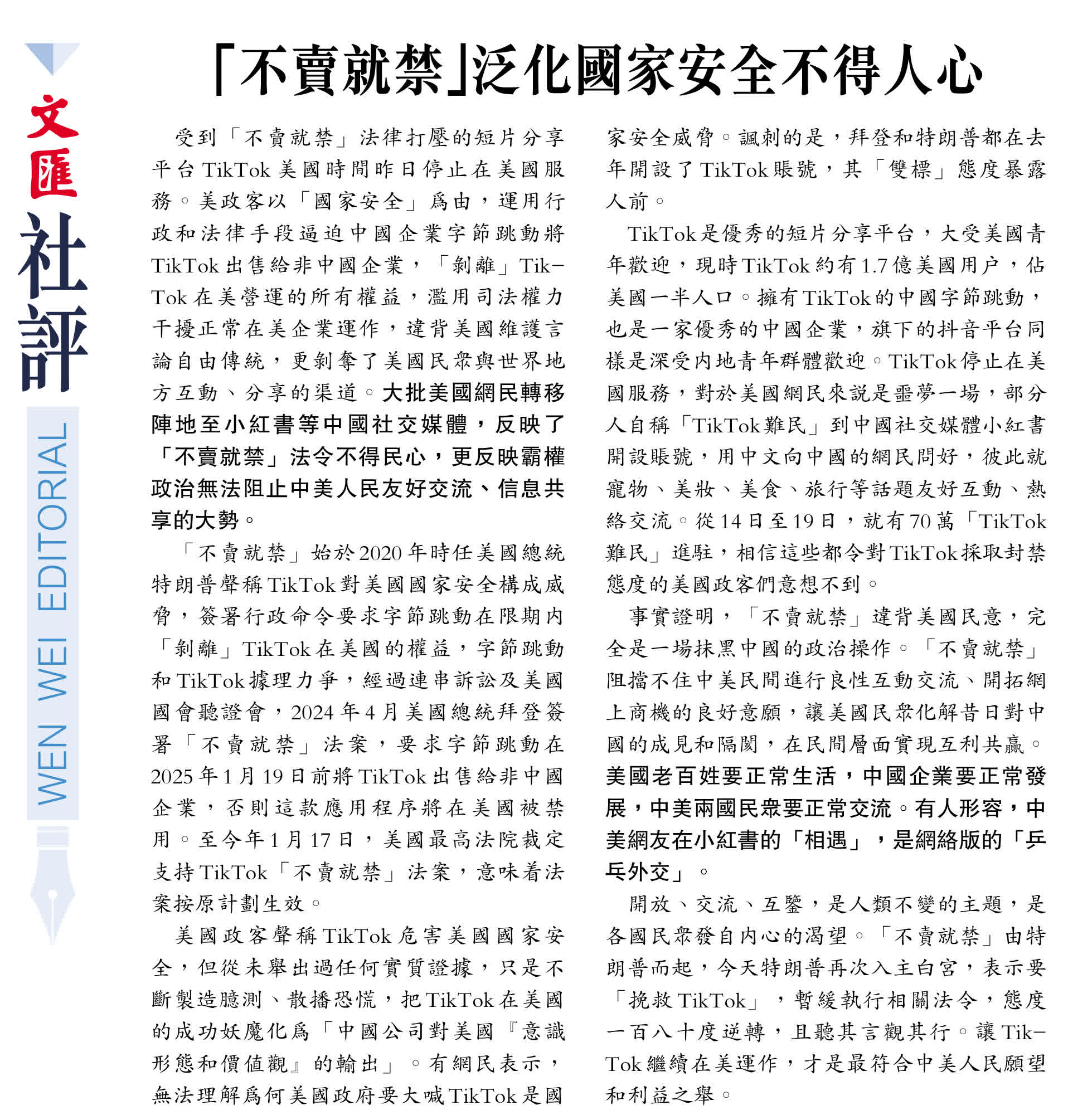 受到「不賣就禁」法律打壓的短片分享平台TikTok美國時間昨日停止在美國服務。美政客以「國家安全」為由,運用行政和法律手段逼迫中國企業字節跳動將TikTok出售給非中國企業,「剝離」TikTok在美營運的所有權益,濫用司法權力干擾正常在美企業運作,違背美國維護言論自由傳統,更剝奪了美國民眾與世界地方互動、分享的渠道。大批美國網民轉移陣地至小紅書等中國社交媒體,反映了「不賣就禁」法令不得民心,更反映霸權政治無法阻止中美人民友好交流、信息共享的大勢。