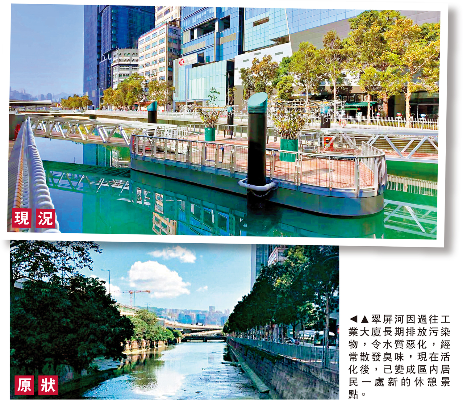 發展局局長甯漢豪昨日發表網誌,表示渠務署致力提升排水設施防洪的能力,秉承「綠水青山就是金山銀山」的理念,積極實踐「河畔城市」概念,而活化後的觀塘翠屏河是「最佳例證」。翠屏河經活化後提升了防洪能力,亦改善氣味問題,河畔長廊亦已全面開放。多名街坊表示,活化後的翠屏河環境優美,吸引更多人到河畔休憩。