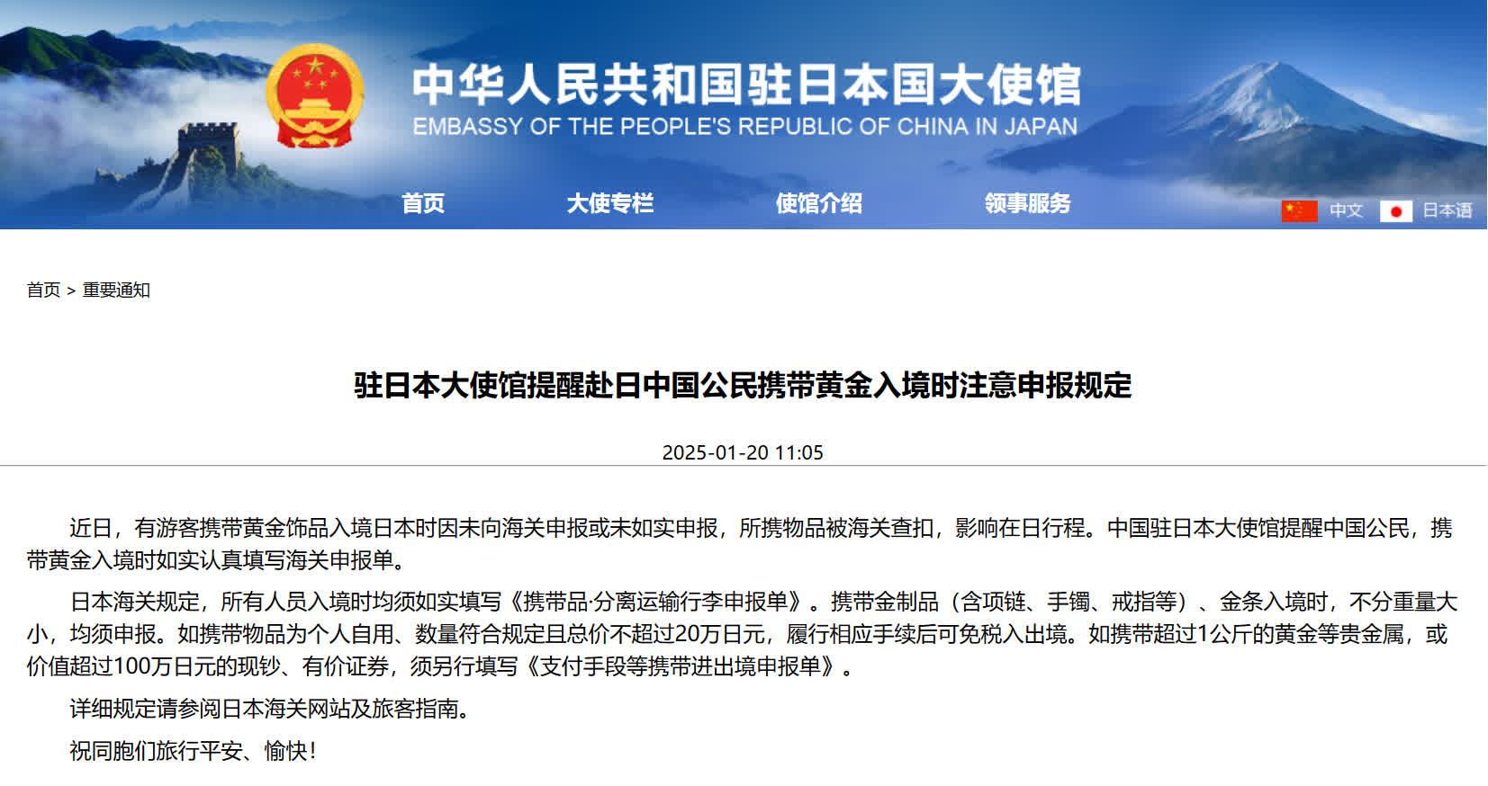 據中國駐日本大使館微信公眾號消息,1月20日,中國駐日本大使館發布《駐日本大使館提醒赴日中國公民攜帶黃金入境時注意申報規定》。