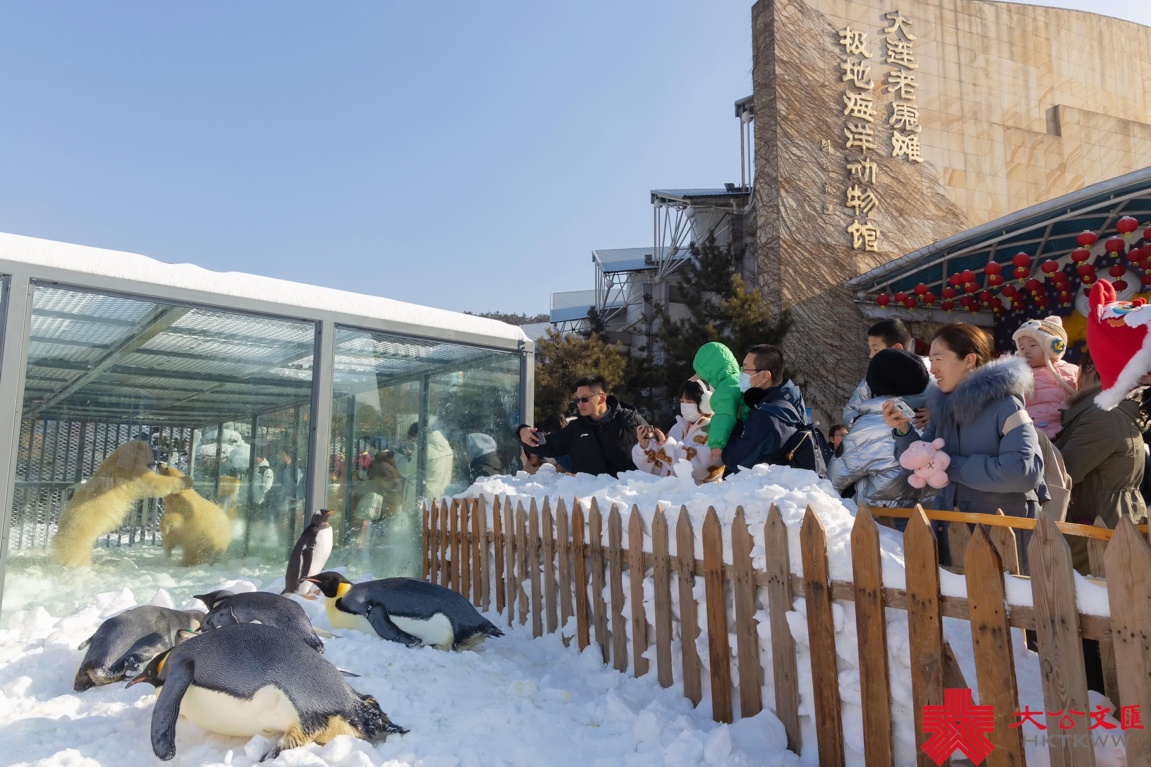 此次冰雪嘉年華,大連老虎灘海洋公園帶來北極熊與帝企鵝的「跨界」相遇。皚皚白雪中,北極熊「糰子」、「圓子」與南極帝王企鵝們展開極地「頭號明星」爭奪。據介紹,公園方採用真冰真雪在極地館外精心打造了仿真極地戶外動物互動展示區,真實還原北極熊與帝企鵝冰天雪地的生長環境。遊客不僅可以見證北極熊與帝企鵝的「世紀會晤」,還將看到南北極動物大巡遊。