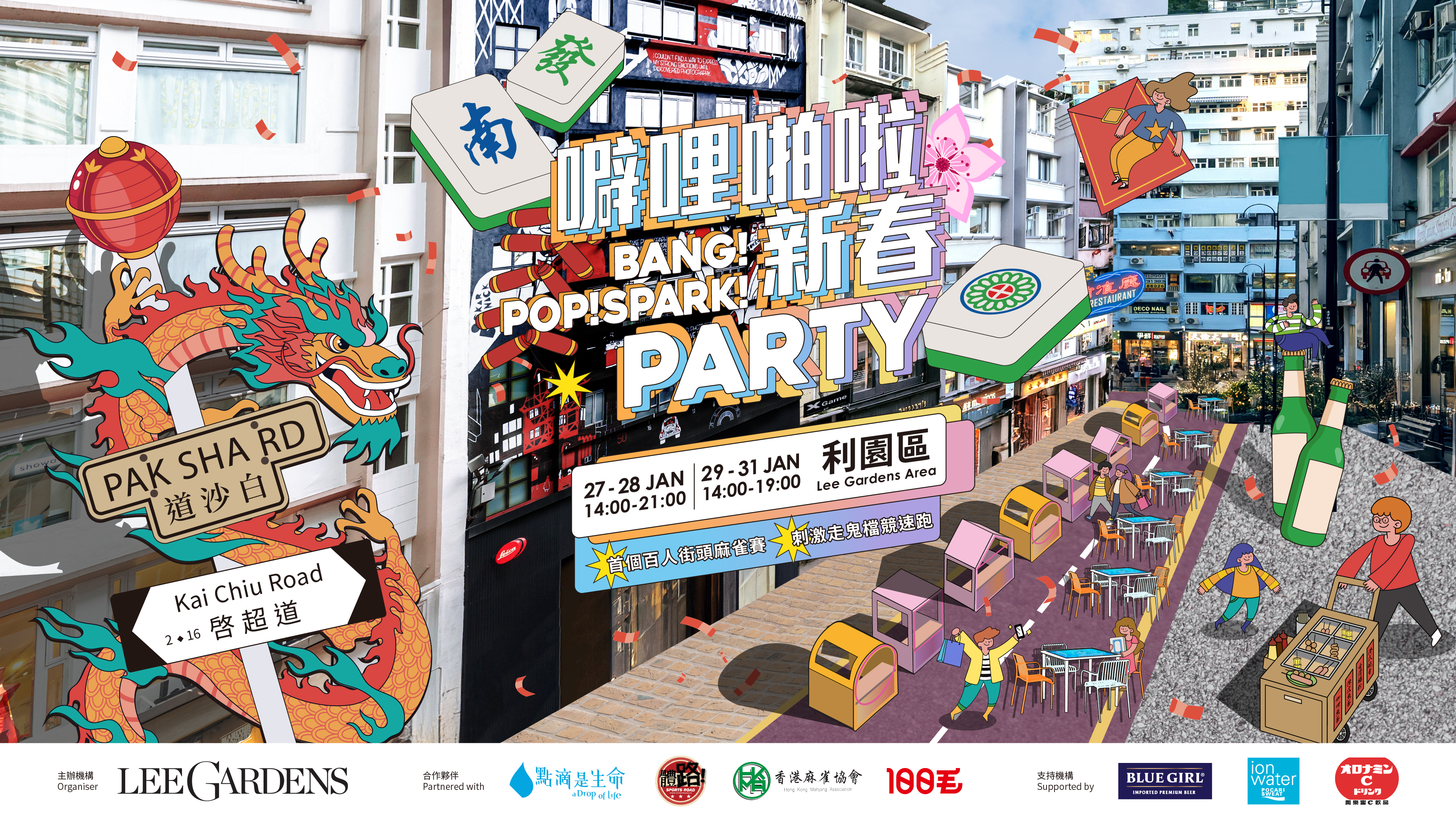 由年廿八至年初三(1月27日至1月31日),白沙道及啓超道將變身為農曆新年玩轉派對熱點!年初一至年初三特設大型街頭競賽活動,包括「利園Street Game」、「走鬼檔競速大賽」及「百人游乾水麻雀挑戰賽」,還有特備節目100毛「初三赤口辯論」熱鬧歡賀新年!利園區更特別於年初一至三安排Hip Hop醒獅、LED舞龍及人氣街頭樂隊等破格賀年表演。