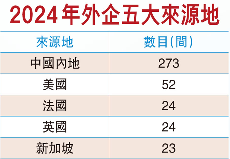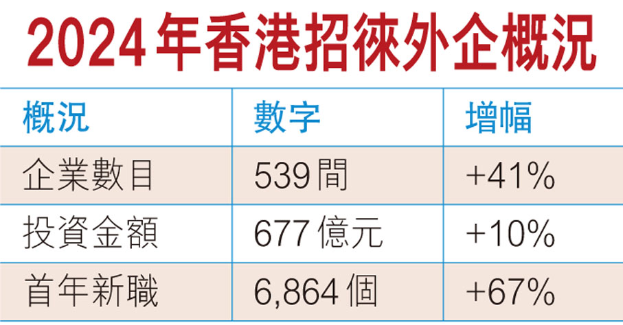 (香港文匯報 記者 莊程敏)香港特區政府積極招商引資見成效,投資推廣署昨日公布,去年共協助539家境外企業在港設立或擴張,增41%創新高。這些外企落地後帶來6,864個職位,按年增逾67%;帶來的總投資677億元,亦創新高,按年增10%。外企主要來自中國內地,其次為美國、法國、英國及新加坡。投資推廣署署長劉凱旋表示,去年招商引資成果創下歷史新高,反映香港作為亞洲領先的商業樞紐,營商吸引力有增無減,海外和內地企業對香港充滿信心,並選擇香港作為其拓展亞洲區域業務的基地,讓香港的「超級聯繫人」及「超級增值人」角色為企業帶來獨一無二的優勢。