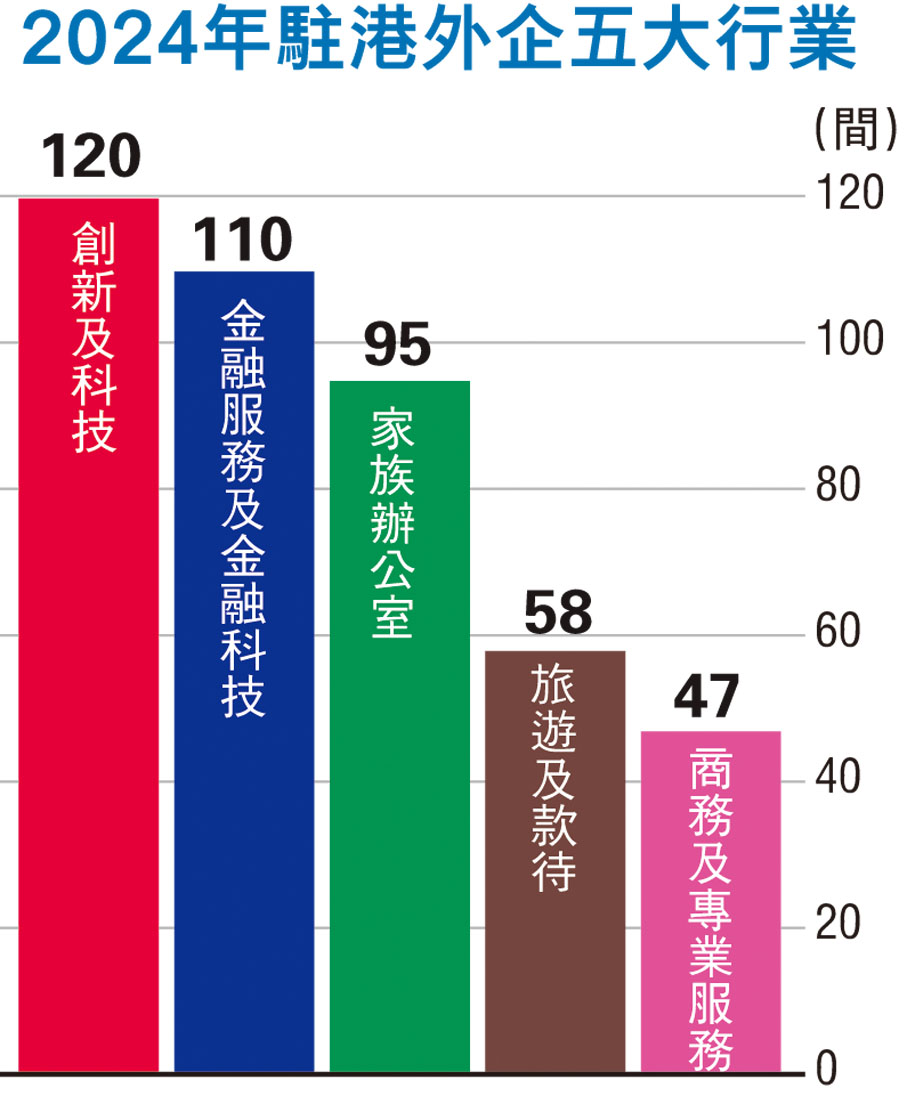 該署指,多元與高端產業的投資,帶動外來直接投資表現強勁。去年進駐香港的五大行業分別是創科、金融、家辦、旅遊,以及商務與專業服務。據估計,這些企業為香港經濟帶來超過677億元的投資,較前年增長約10%,同創新高;預計在營運首年為香港創造6,864個新增職位,比前年增長超過67%。