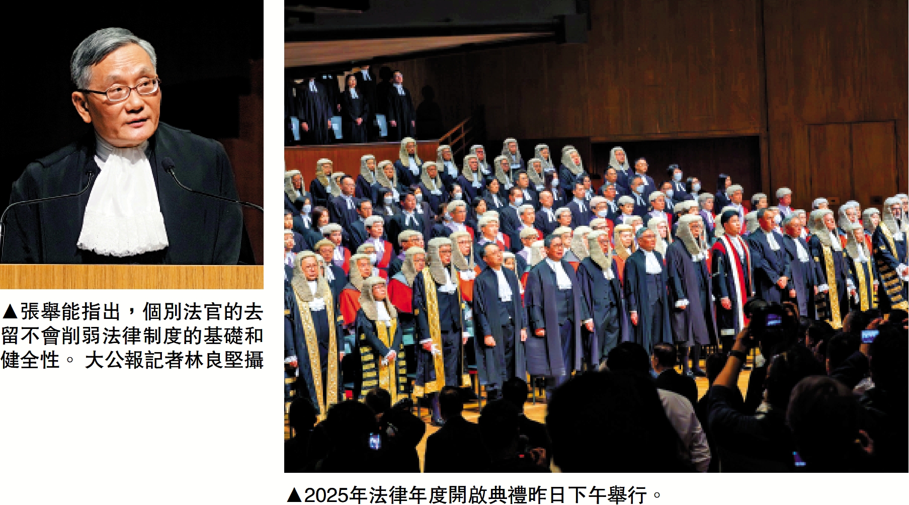 (大公報 記者 龔學鳴)2025年法律年度開啟典禮昨日在香港大會堂舉行。終審法院首席法官張舉能致辭時表示,香港在「一國兩制」的保證下維持獨特的法律制度,與內地的法律制度既不同但又有內在聯繫。法院會以符合「一國兩制」的方式去應用法律,以維護國家安全。