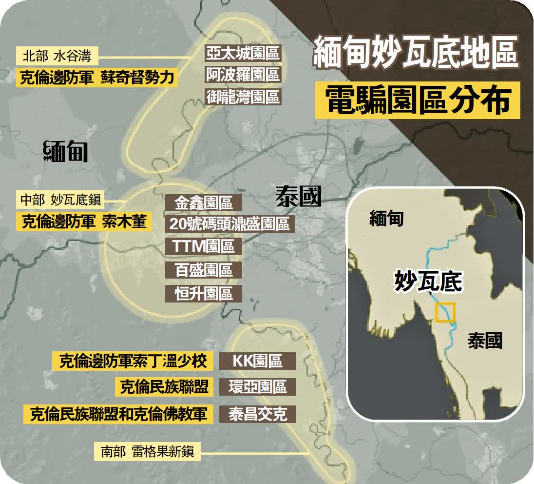 2019年8月,柬埔寨首相洪森簽發「網絡賭博禁令」之後,這股台灣犯罪勢力向妙瓦底轉移。謝玲分析,妙瓦底位於大湄公河流域的泰緬交界處,水陸交通便捷,有利犯罪團夥運輸藏匿,由緬甸政府軍扶植、具有軍方背景的克倫邊防軍(BGF)和當地民族地方武裝勢力共同管轄。相較緬北,在妙瓦底搭建犯罪窩點成本低。