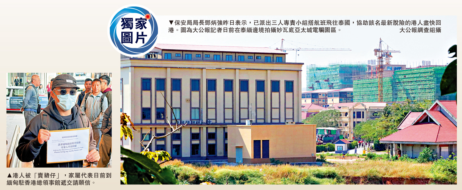 據悉,該名近日獲救的男子29歲,在去年10月被誘騙到緬甸妙瓦底的詐騙園區從事非法工作,至周日(19日)獲釋返回泰國,他即時與家人聯絡,目前身處在泰國,家屬並沒有支付贖金,惟其身上沒有證件及現金,身體狀況尚好,詳細情況要回港具體驗傷。