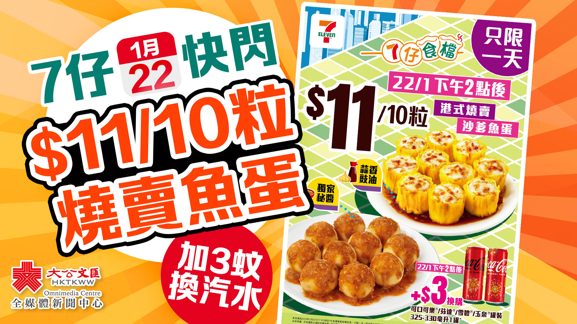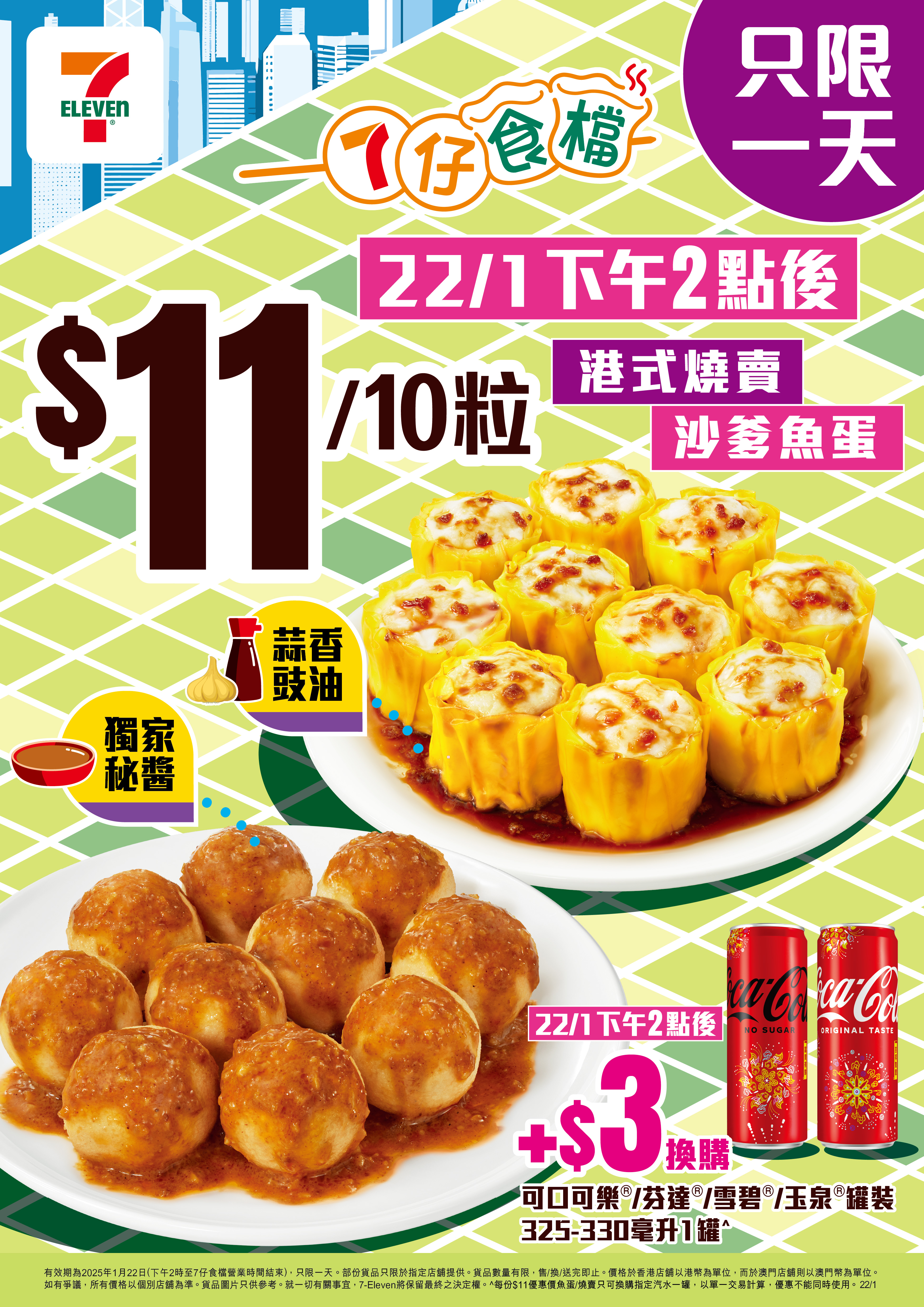同樣由1月22日下午2時起,購買$11/10粒燒賣或沙嗲魚蛋同時,只需另加$3即可換購1罐可口可樂/芬達/雪碧/玉泉飲品。部分貨品只限於指定店舖提供。貨品數量有限,售/換/送完即止。